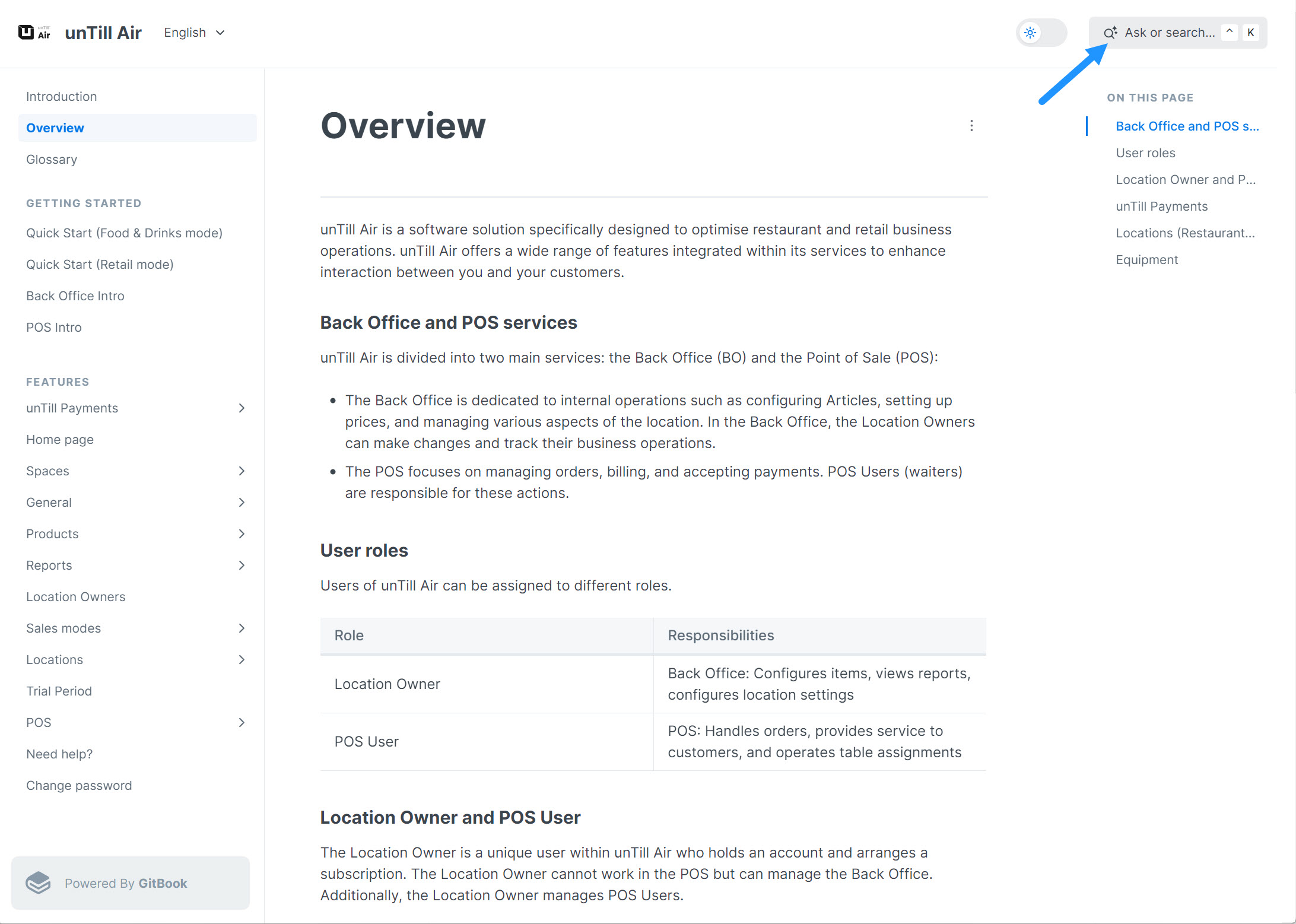 Im unTill Air-Handbuch können Sie das AI-Tool verwenden, um die benötigten Informationen schnell und genau zu finden.