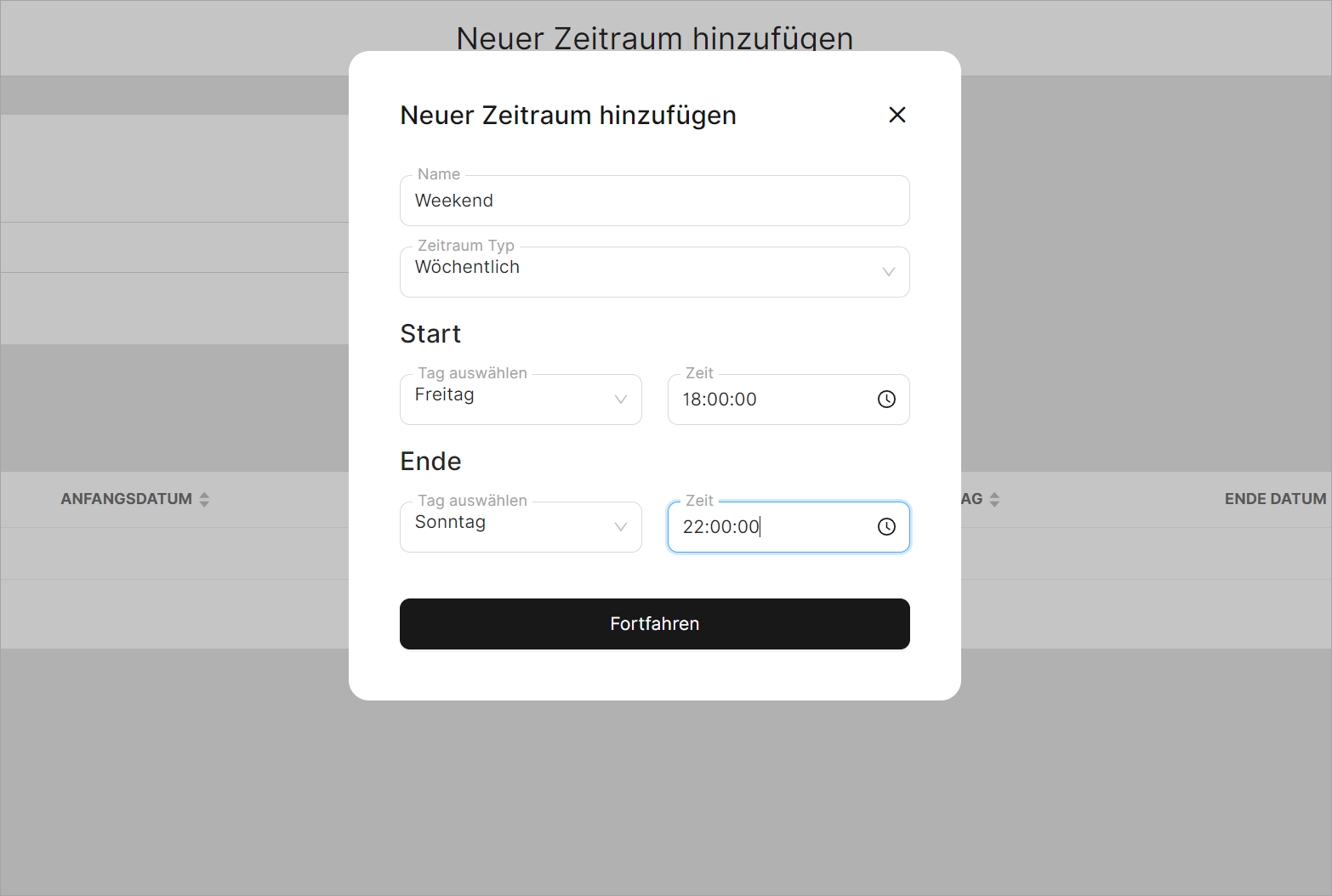 - Legen Sie auf der Grundlage des von Ihnen gewählten "Zeitraum-Typ" die zeitlichen Beschränkungen fest.