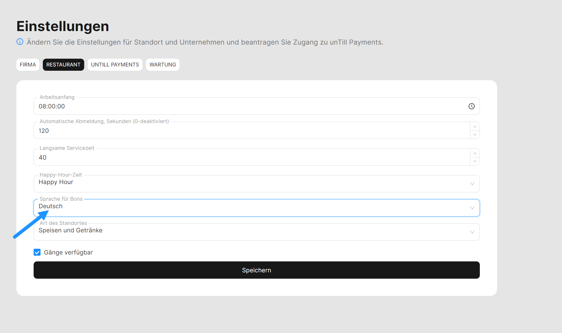 Um die Sprache für die Belege an Ihrem Standort einzustellen, gehen Sie bitte folgendermaßen vor: