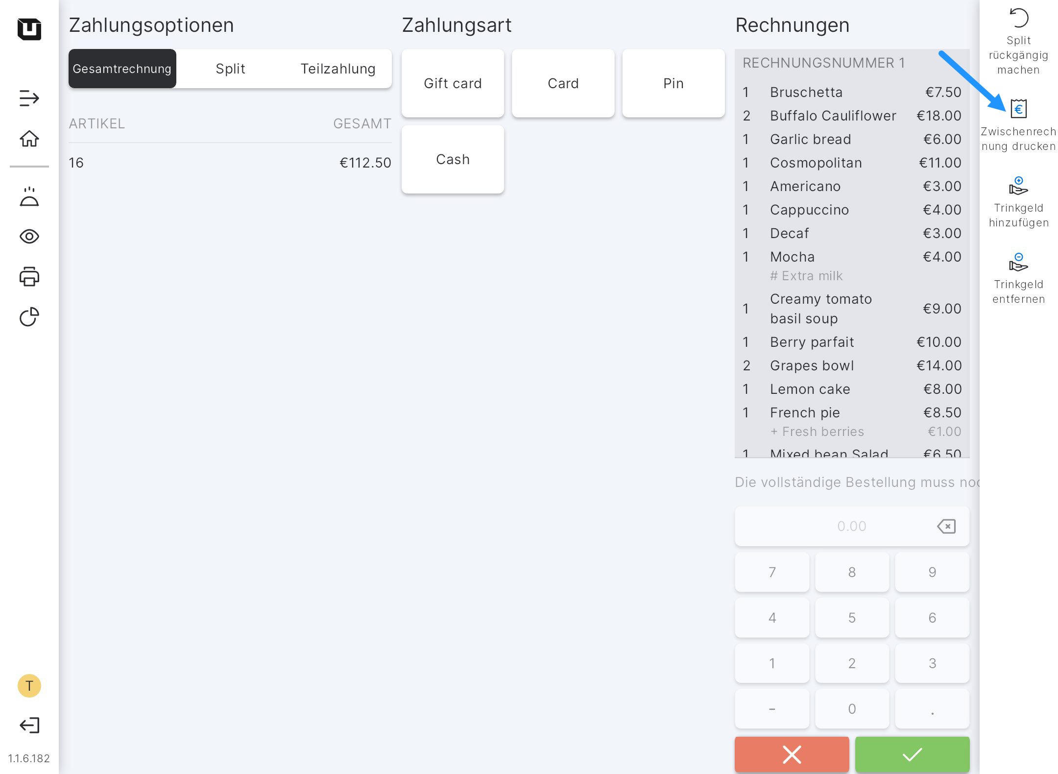 Die Zwischenrechnung wurde zwar ausgestellt, aber es gibt keine Einschränkungen deswegen. Sie können den Tisch immer noch transferieren, weitere Artikel bestellen und die Rechnung splitten.