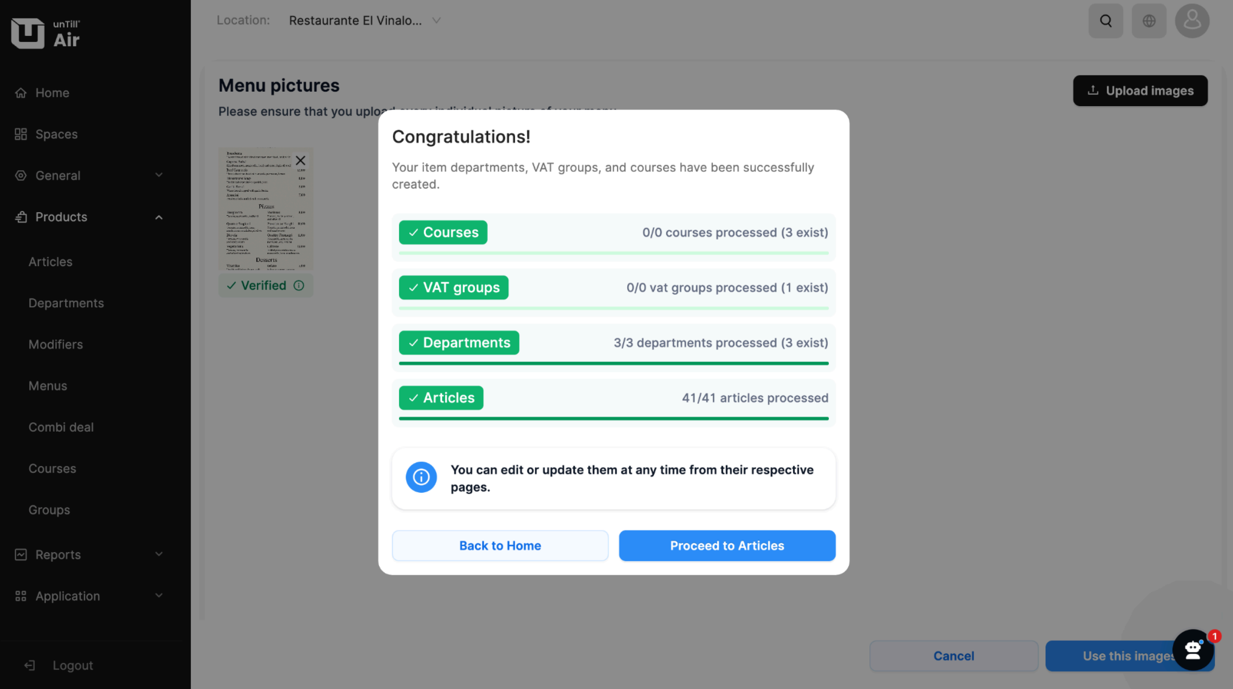 In unTill Air, you can speed up the onboarding process by generating your article list automatically using AI-powered menu recognition. This feature converts uploaded menu images into structured Back Office data. This way, you don’t have to manually enter data article by article, making the process quick and simple so you can proceed directly with testing the POS system.