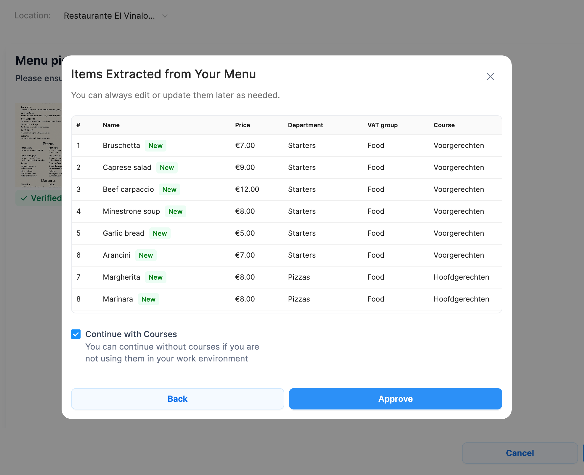 - You will now see a list of all items extracted from your menu, including each element’s details (Name, Price, Department, VAT group, and Course). Any missing information will appear as an empty field, which you can edit manually later. Click ‘Approve’ to confirm the new items.