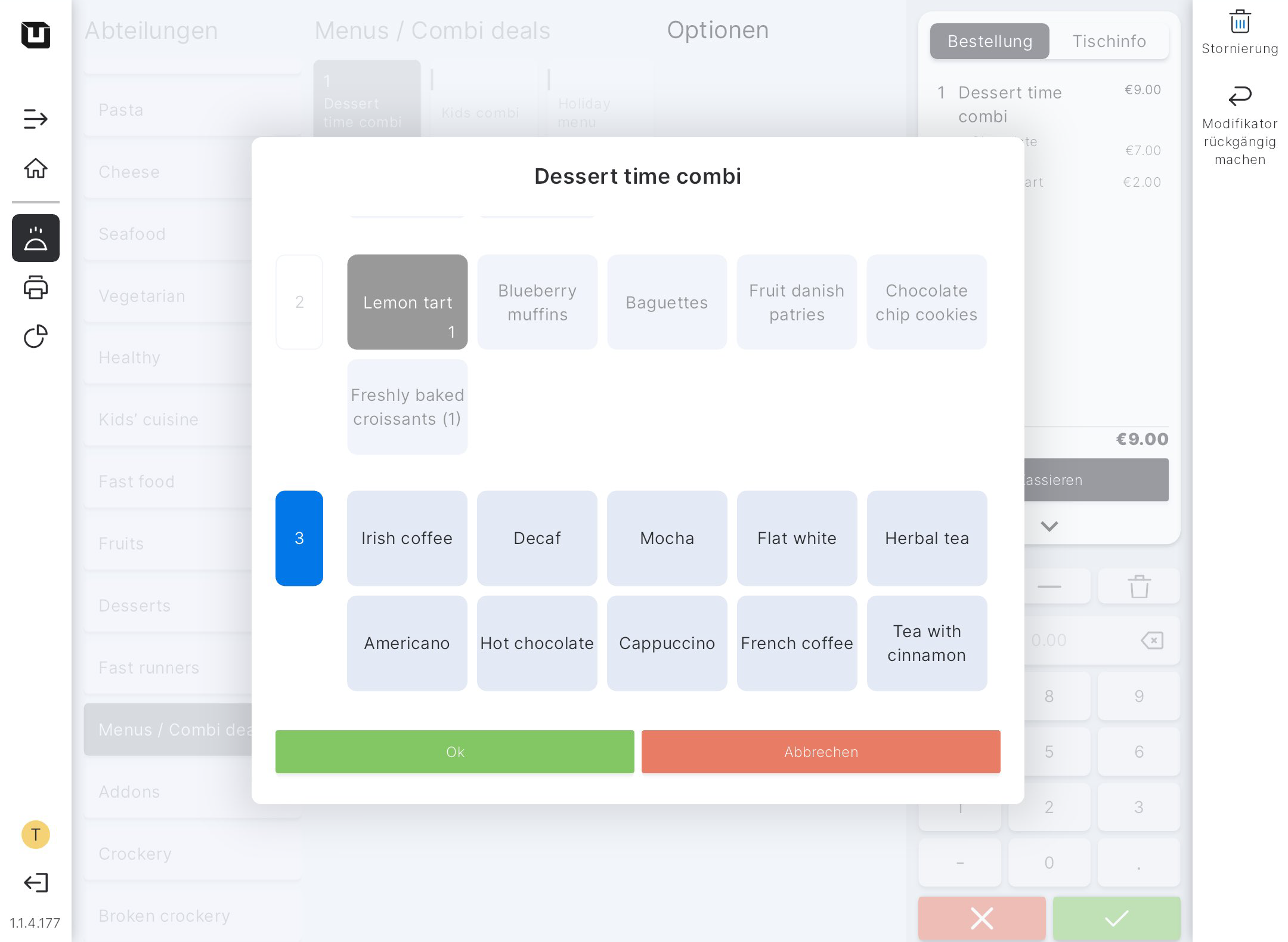 Sie können erst dann auf "Kassieren" klicken und mit der Bestellung fortfahren, wenn Sie den Kombi-Deal abgeschlossen haben. Wenn ein unvollständiger Kombi-Deal vorliegt und Sie auf die Schaltfläche "Kassieren" tippen, erscheint ein Pop-up-Fenster, in dem die noch nicht bestellten Artikel des Kombi-Deals angezeigt werden.