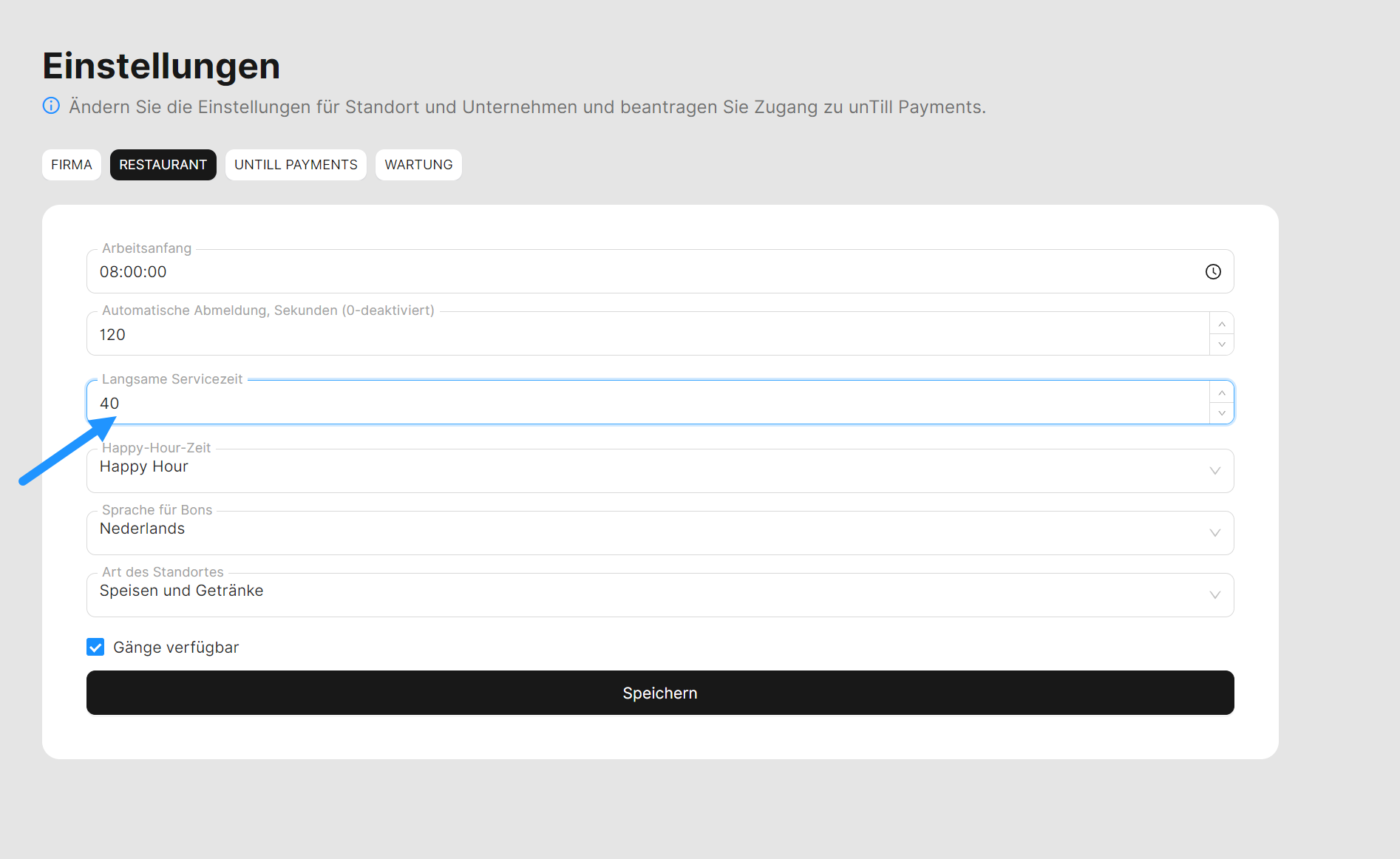 Wenn Sie dieses Feld mit dem Wert 0 belassen, wird diese Funktion deaktiviert und die POS-Nutzer an diesem Standort sehen keine Symbole, die die langsame Servicezeit anzeigen.