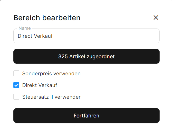 Wenn Sie einen Bereich mit der Funktion Direktverkaufsbereich erstellen, können Sie ihn immer noch nach Belieben konfigurieren, einschließlich der Zuordnung von Artikeln zu diesem Bereich und der Aktivierung der Funktionen Sonderpreis und Zweite Mehrwertsteuer.