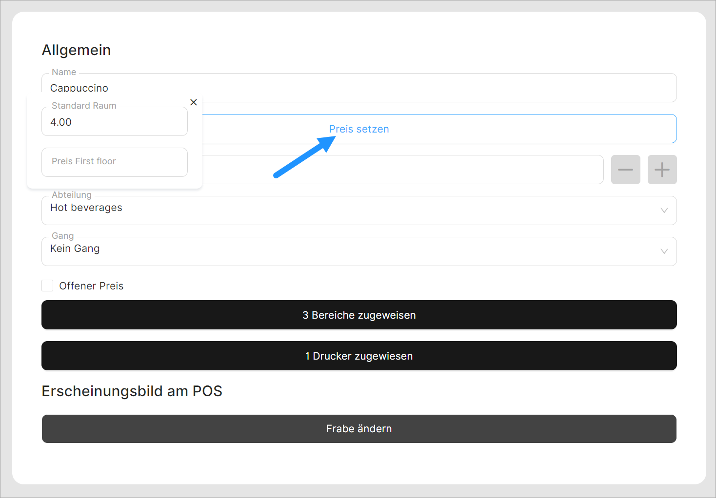 In solchen Fällen können Sie auch die Funktion "Sonderpreis" für Bereiche aktivieren, in denen das Kontrollkästchen 'Direktverkaufsbereich' aktiviert ist. Dadurch können Sie Artikel zu anderen Preisen anbieten als Bereiche mit Tischen.
