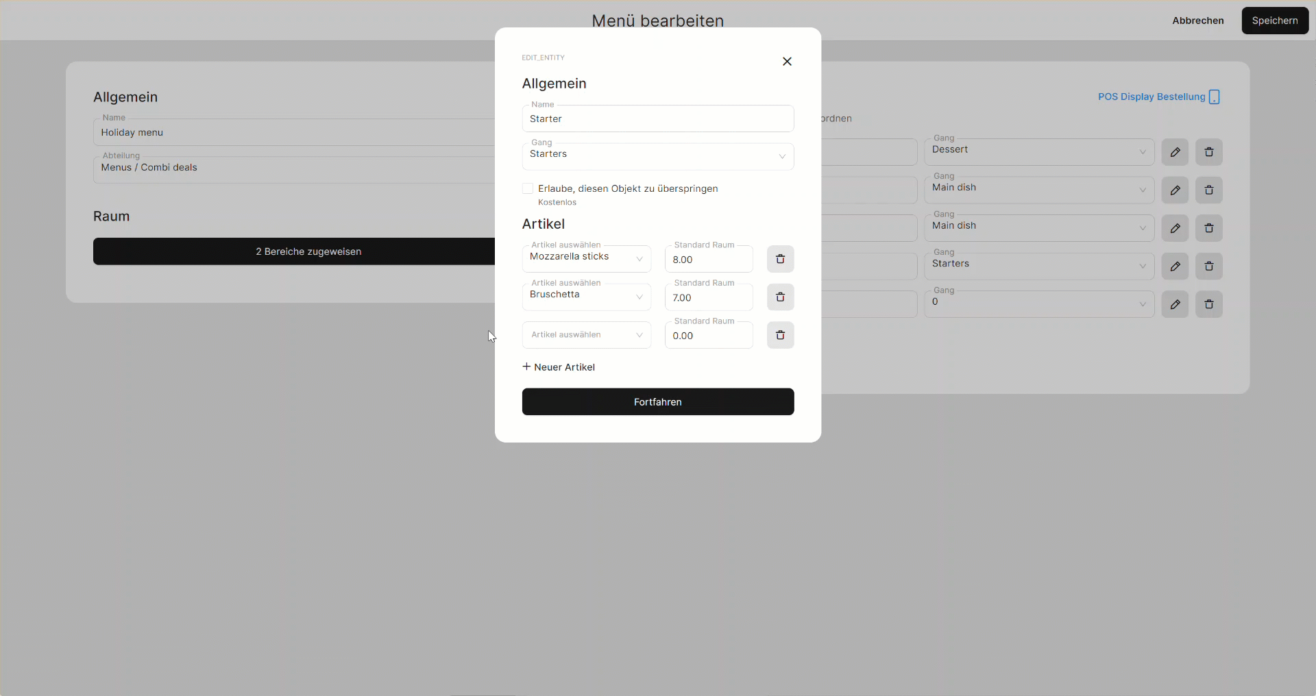 Das bedeutet, dass, wenn Sie einen Gang löschen, dem ein Artikel zugeordnet ist, der Artikel mit dem gelöschten Gang verbunden bleibt. Um diesen Artikel einem anderen Gang zuzuordnen, müssen Sie ihn bearbeiten und einen bestehenden Gang auswählen.