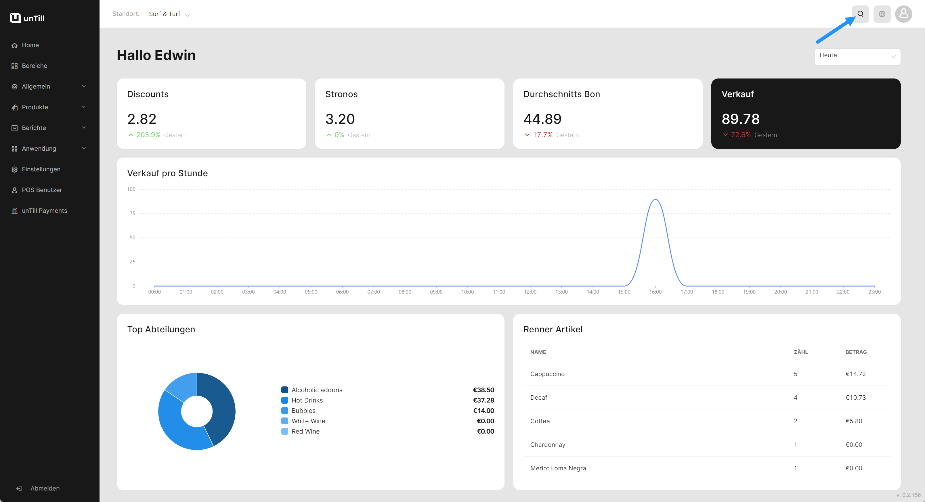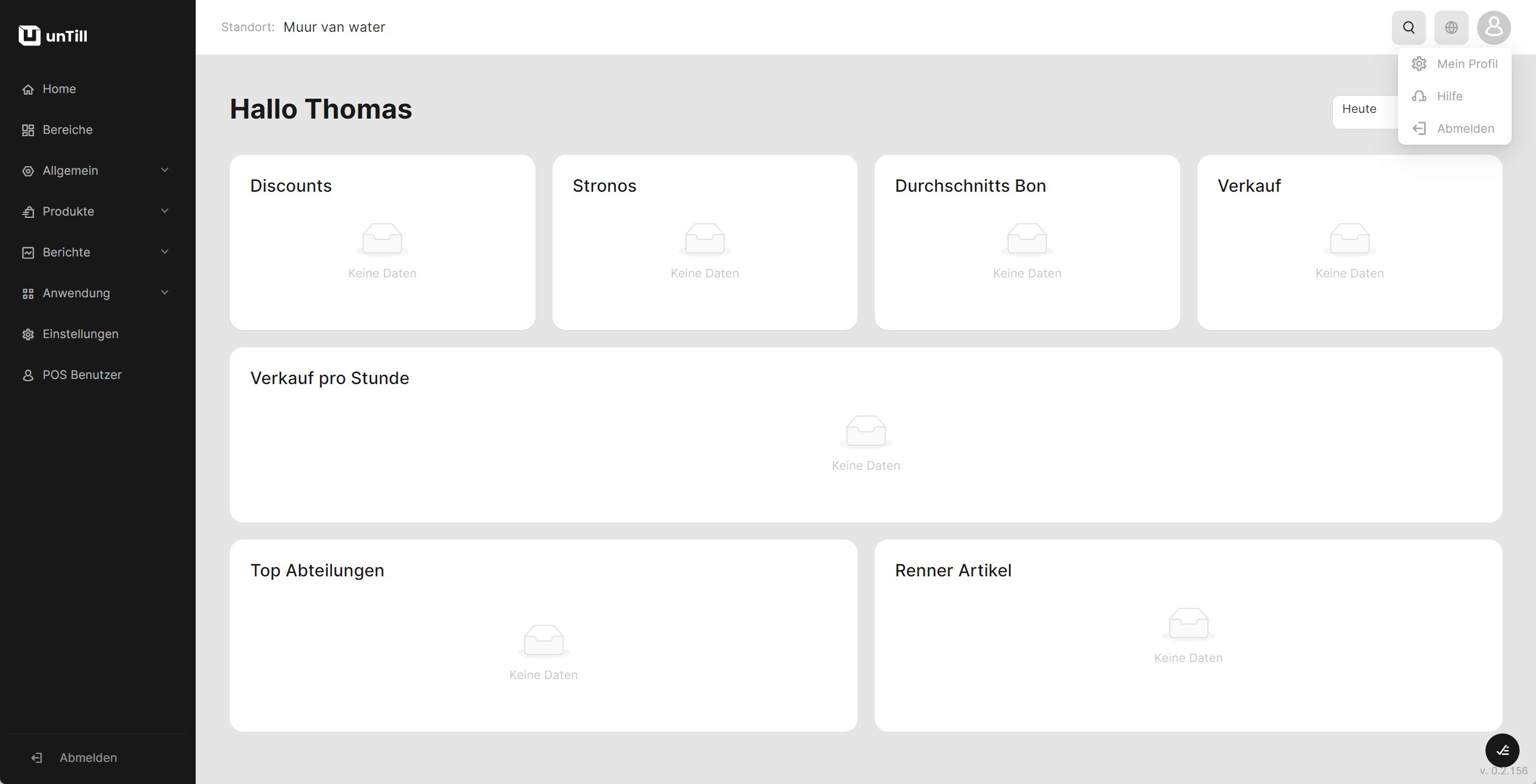 Ihr Profil, mit Einzelheiten zu Abonnements, Standorten und die 'Hilfe?' Seite mit den Kontakten Ihres Resellers or unTill Air-Mitarbeiters, ist nur einen Klick entfernt. Tippen Sie auf das Profilsymbol oben rechts.