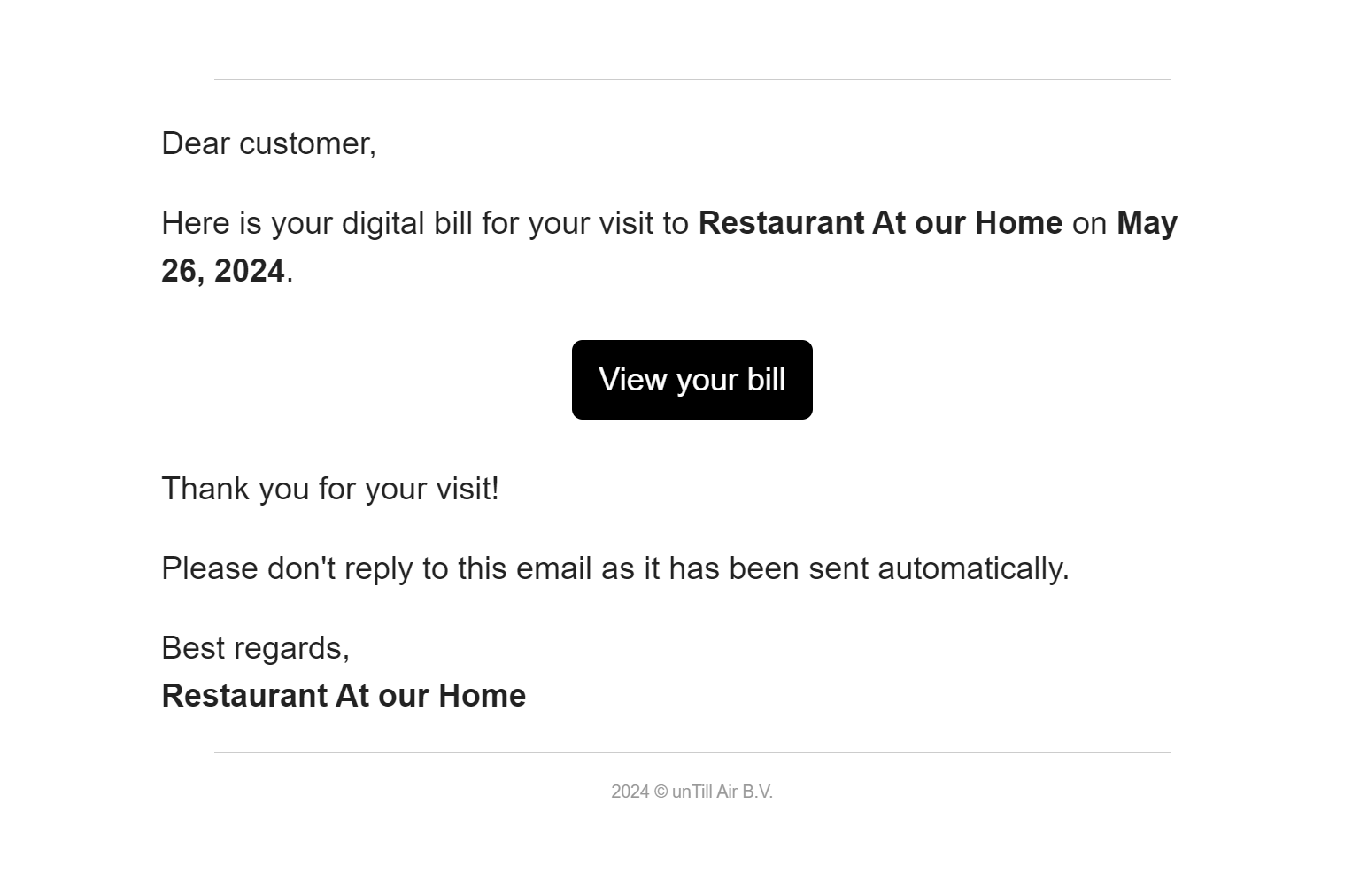 Se enviará un correo con el enlace que lleva a una página de navegador donde el cliente podrá ver y guardar el recibo. El correo indica el nombre de establecimiento donde se realizó el pago y la fecha de pago. A continuación puedes ver un ejemplo de lo que recibe el cliente: