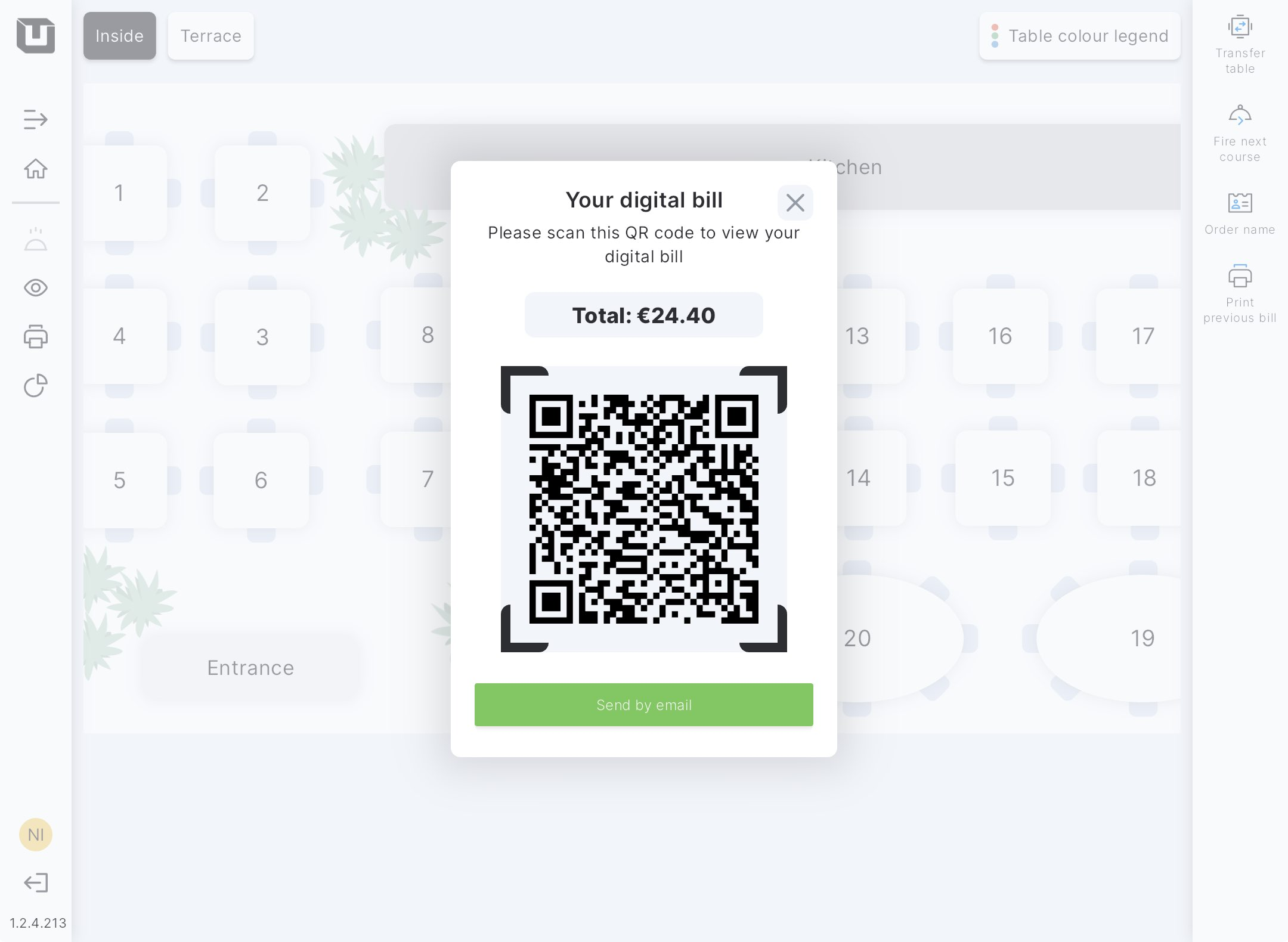 Al finalizar un pedido y tras realizar el pago, aparece una ventana con un código QR, junto con la opción de enviar el recibo digital vía email. Si la cuenta está dividida en partes, se proporcionará un código para cada una de las partes pagadas.