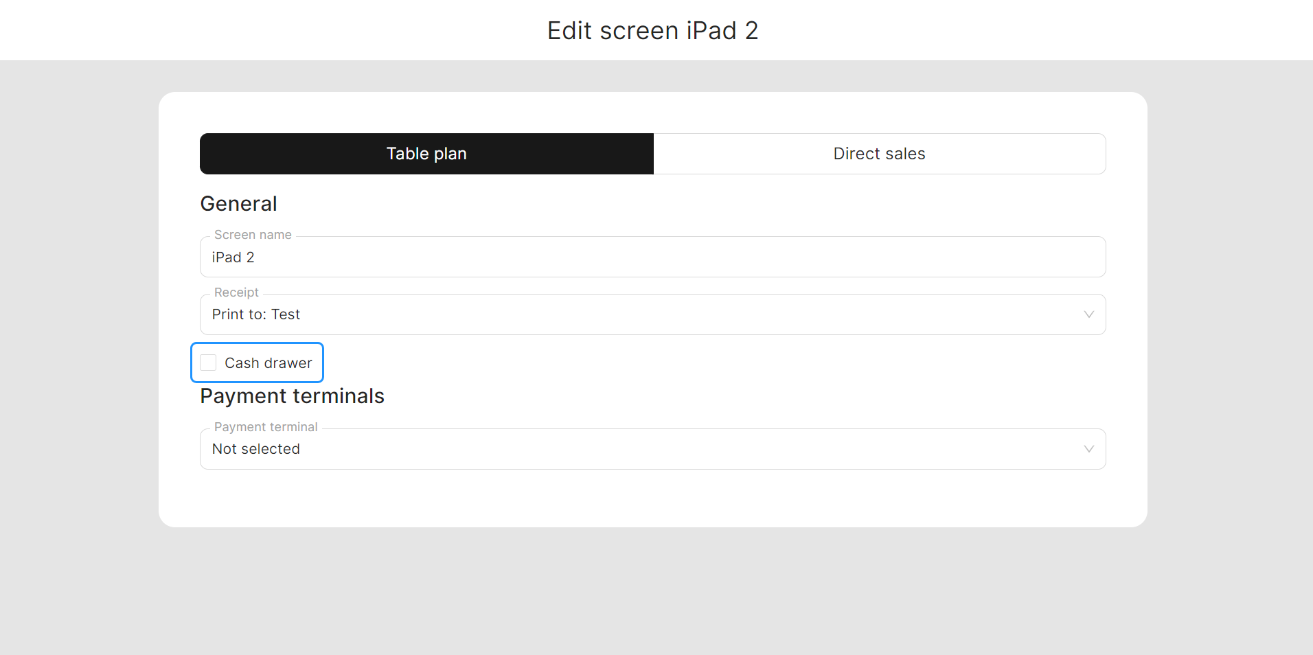Para configurar una caja registradora, marca la casilla correspondiente en la página de edición de pantalla. A continuación, la caja se abrirá automáticamente siempre que se realice un pago en efectivo.