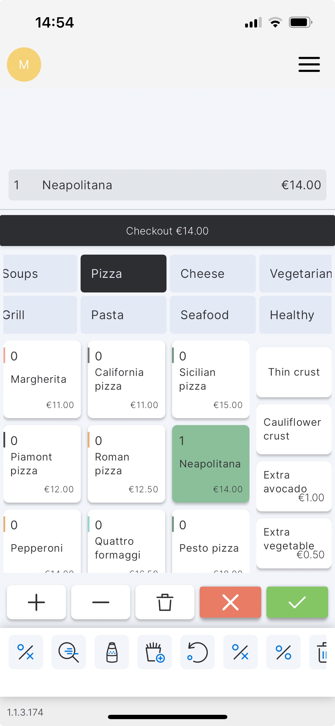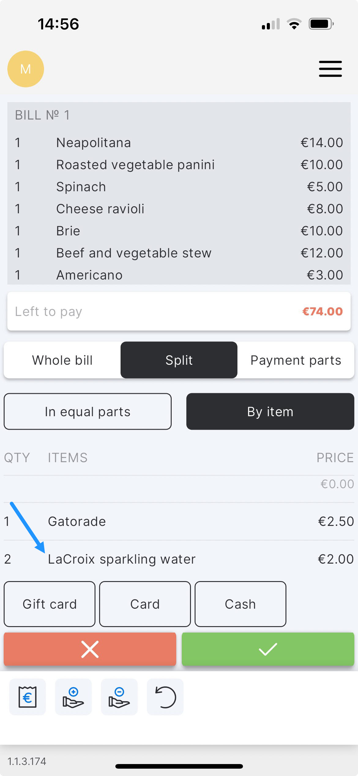 Si necesitas dividir la cuenta por artículos teniendo artículos repetidos en el pedido, pulsa el artículo repetido dos veces para mostrar teclado numérico e indicar cuántos artículos se van a pagar.
