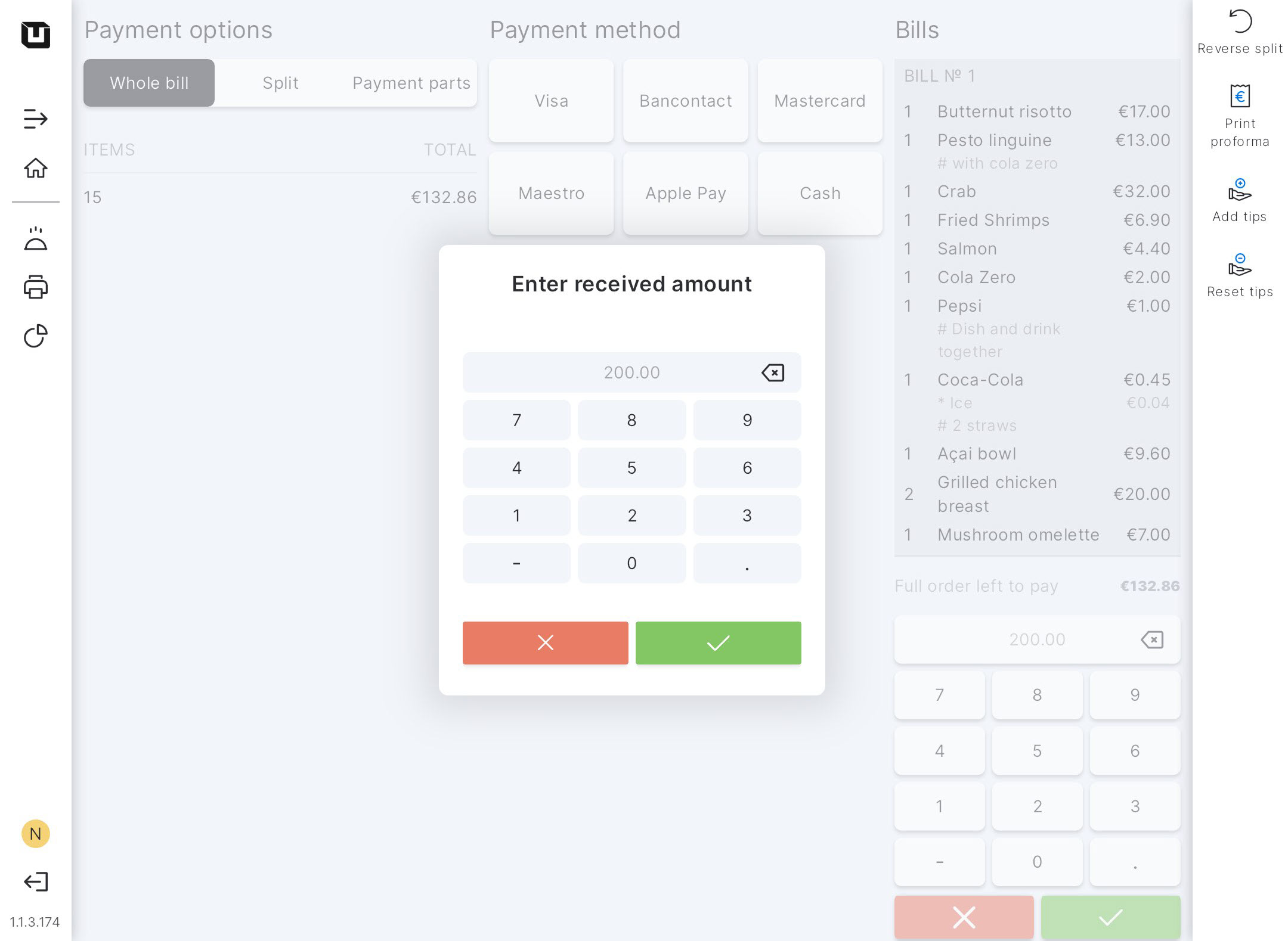 Para usar esta función, el Usuario POS deberá hacer un clic largo sobre el botón de "Efectivo", situado en Métodos de pago. A continuación, verá aparecer una pestaña con teclado numérico, donde se ha de indicar el importe recibido en efectivo.