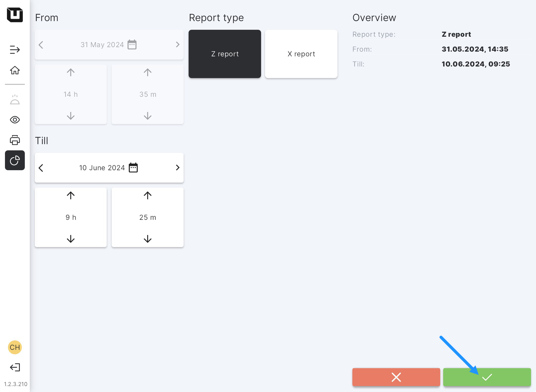 Nota: En el caso del informe Z, el usuario únicamente podrá indicar hasta qué día y hora dura el período del informe. Este documento se genera de manera automática a partir del momento del último reporte.