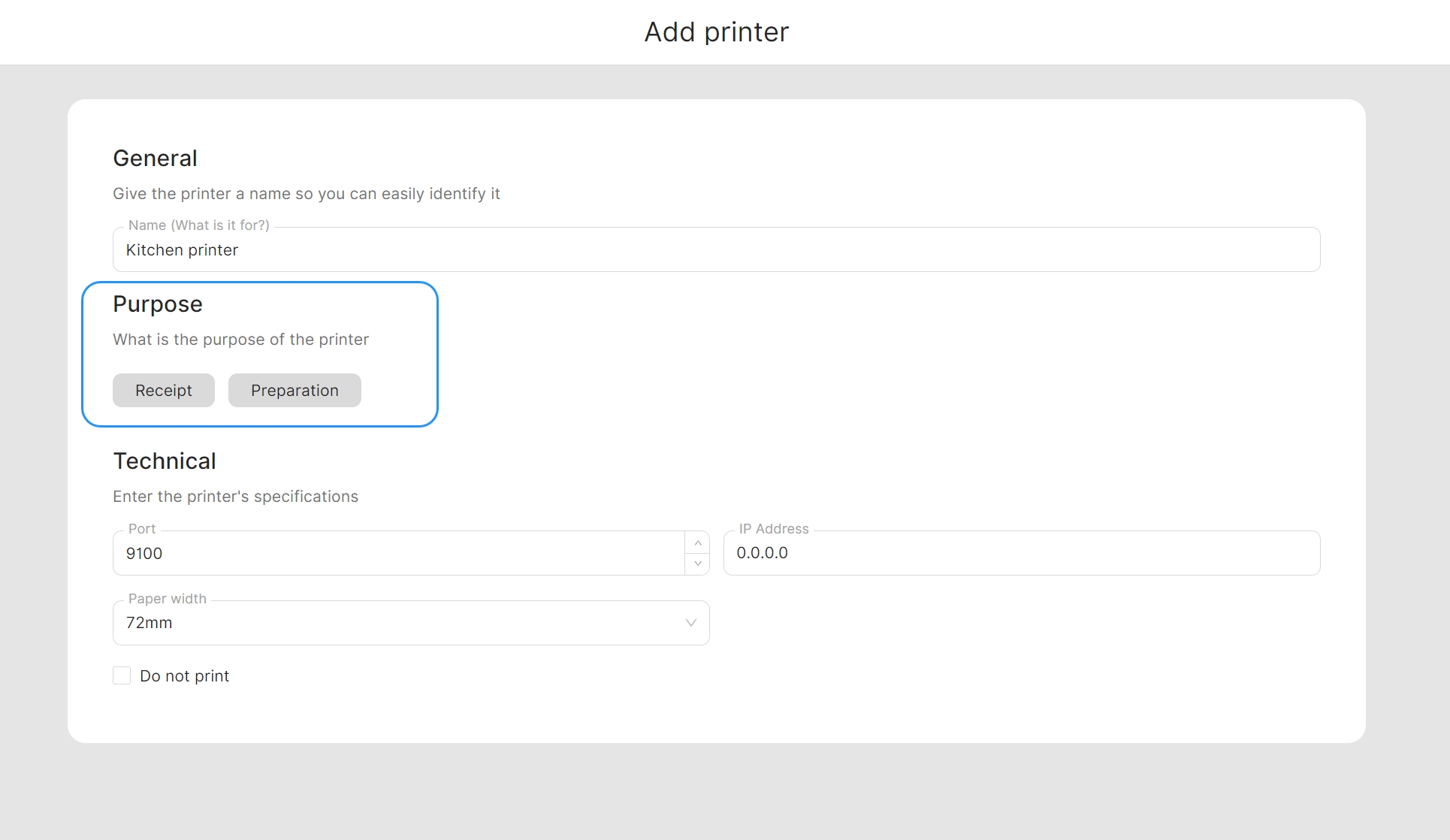 Puedes seleccionar ambas finalidades para un dispositivo, para que la impresora emita tanto los tickets de pedido como los recibos.