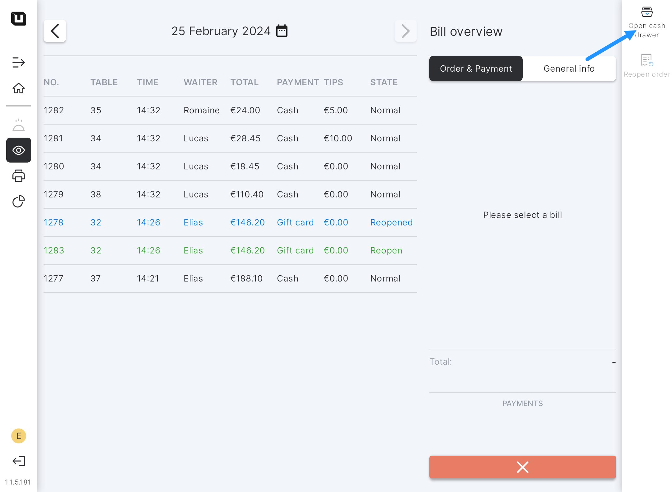 Si reabres el pedido que fue pagado en efectivo, podrás abrir la caja manualmente pulsando el botón situado en la sección de control.