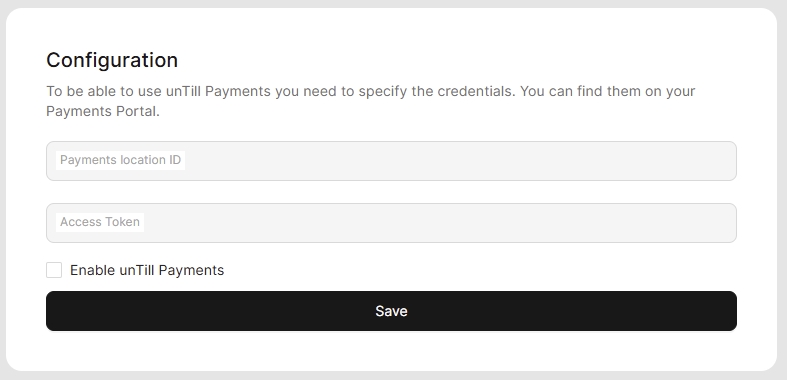 En Back Office > Ajustes > unTill Payments, indica la clave de acceso copiada previamente.