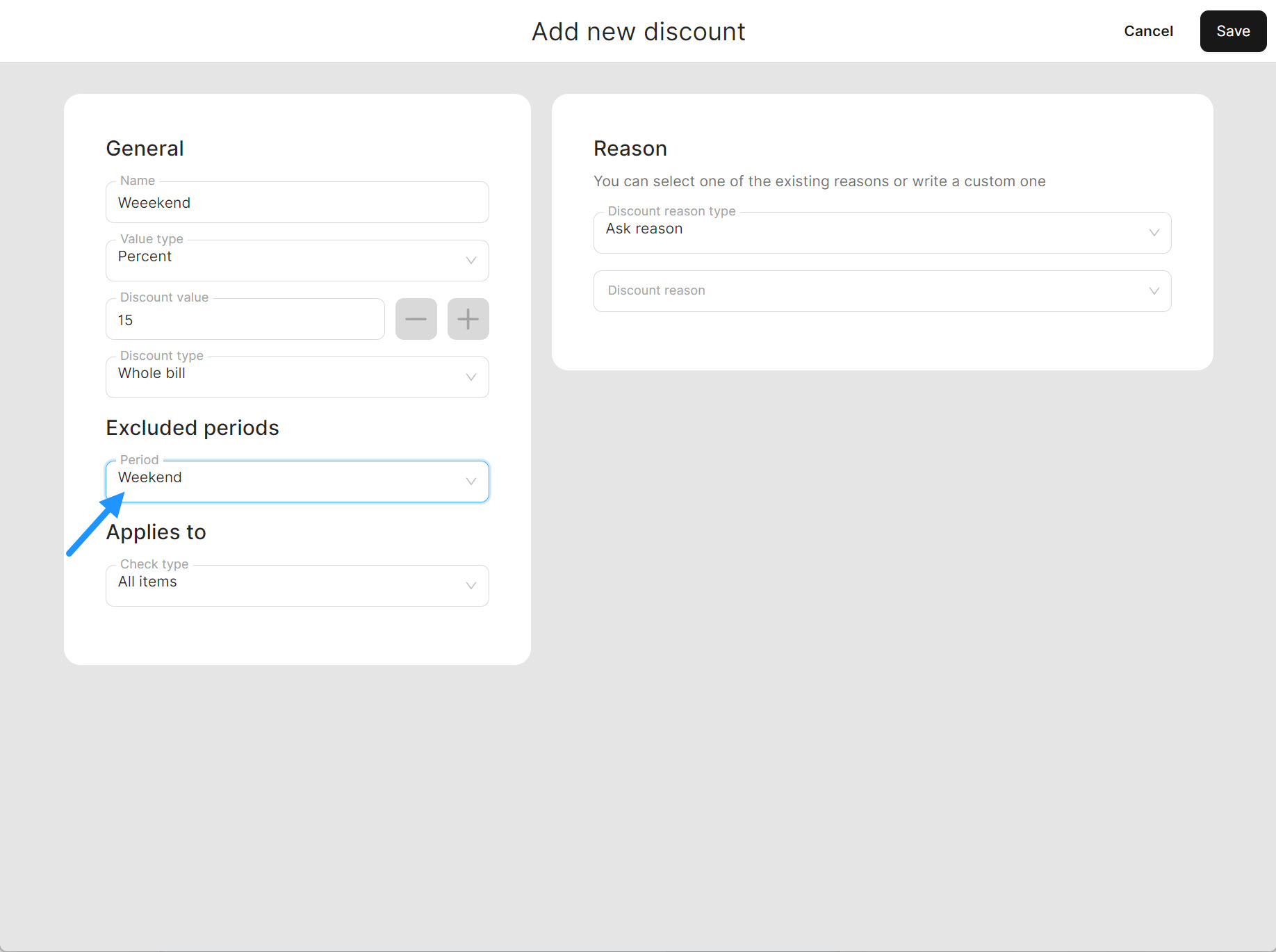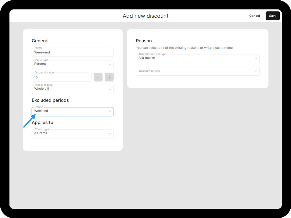 If the period you set is currently active, the time-specific Discount will be visible in the POS Discounts section.