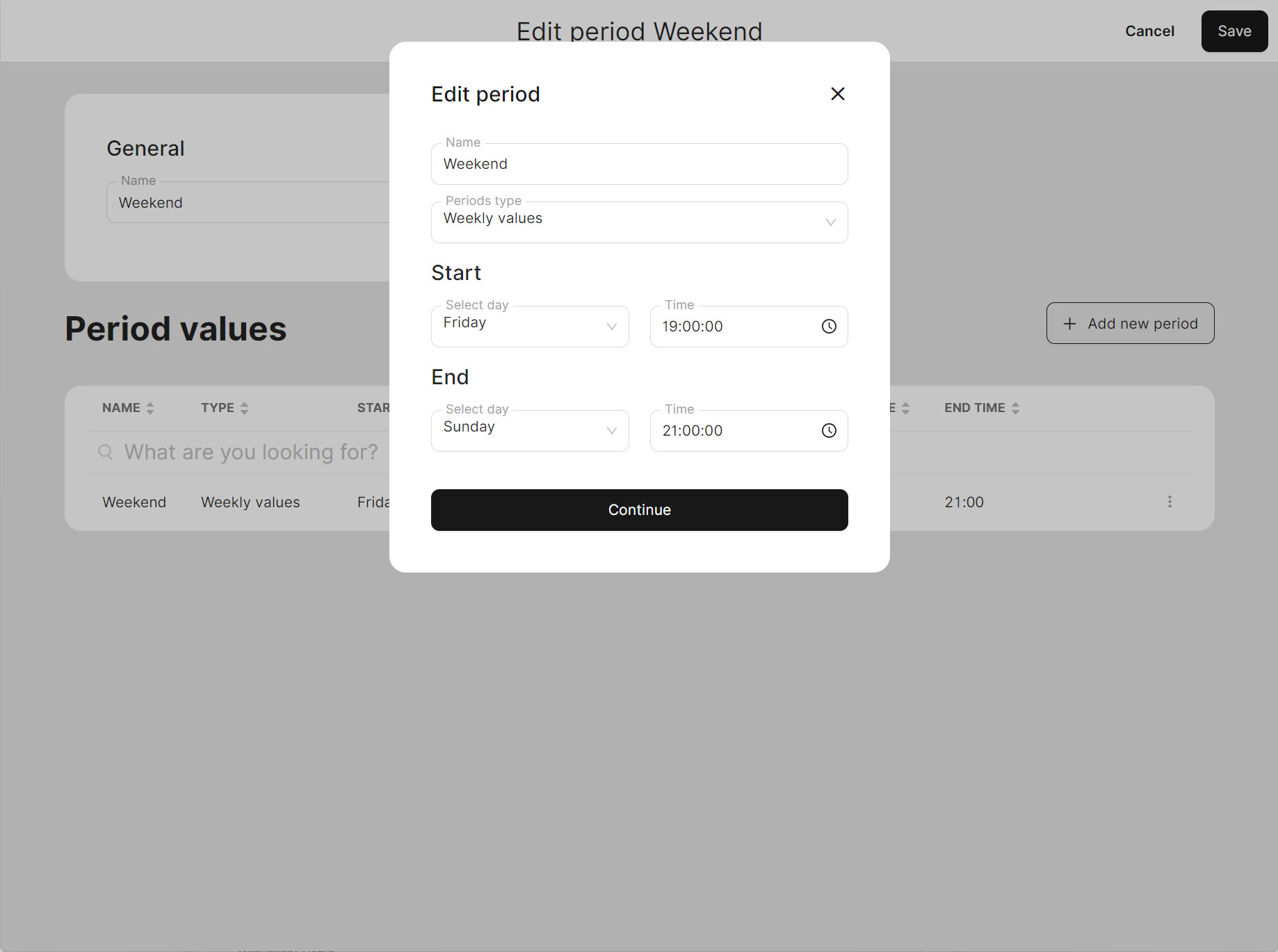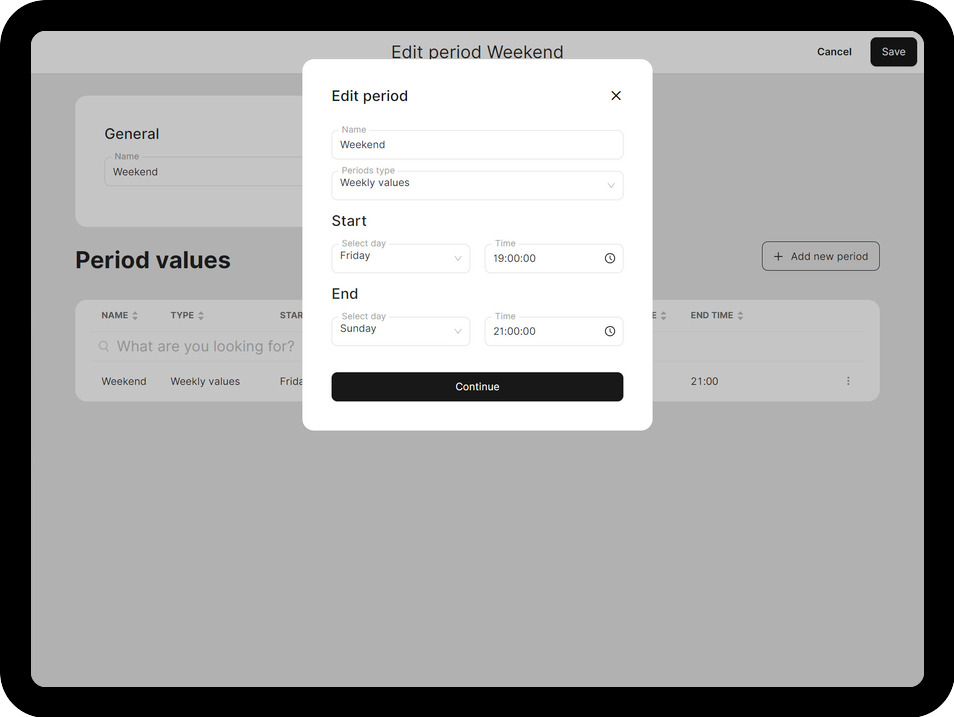 - Based on your selected 'Periods type', specify the time limitations.