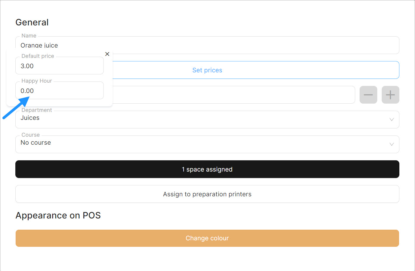 After you activate the Happy hour feature, you will get a new field for setting the Happy hour price in the Articles section.