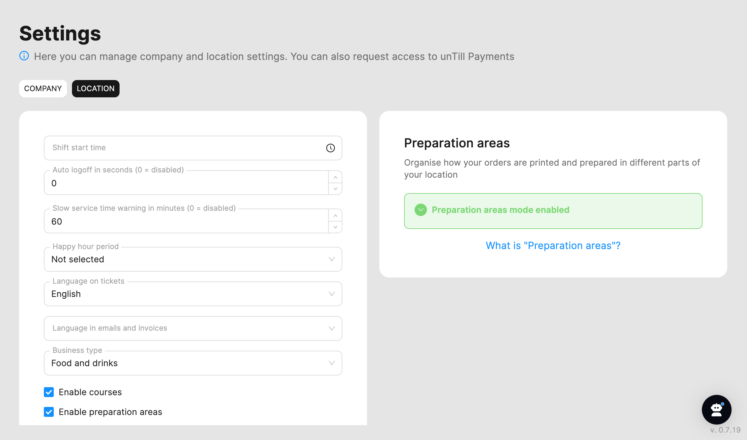 To enable this function, go to Location settings and click the "Switch to Preparation areas" button in the Preparation areas block. When you enable it, you will be asked to confirm your choice, as you will not be able to switch back later. Once enabled, the corresponding section will appear under General in the Back Office, allowing you to create and manage preparation areas.