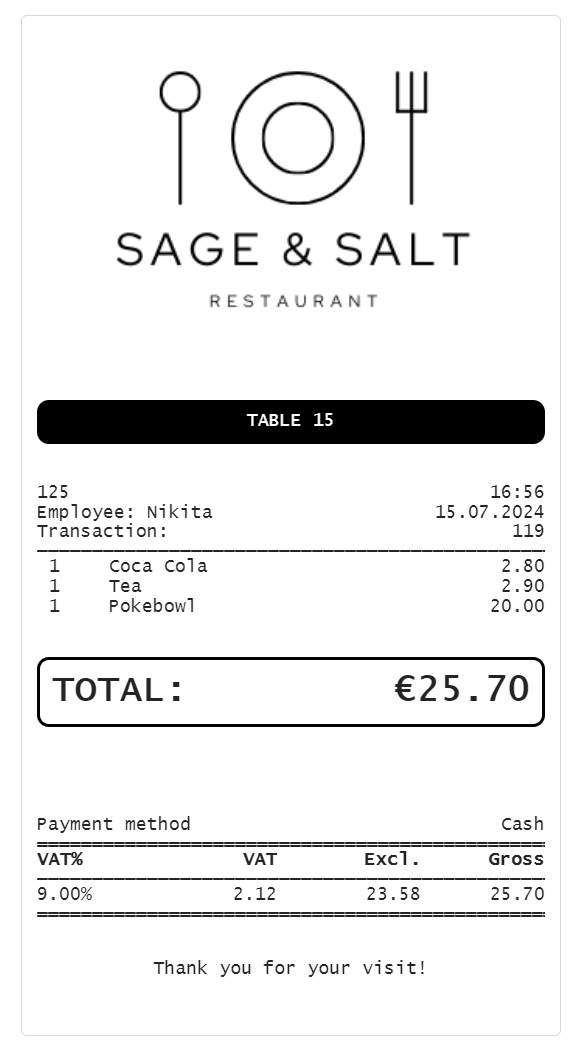 On the bill ticket you can see several columns in the first section, under the information about the number of bill, time and date, name of the POS User (employee), and transaction number.
