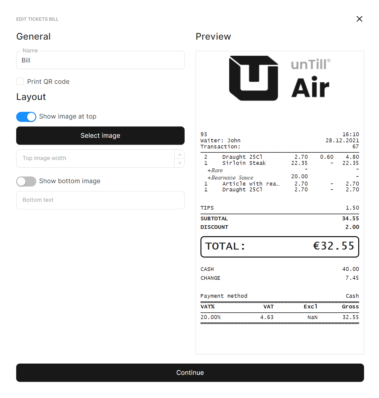 In unTill Air, you are equipped to customise tickets in the way you like. You can change the name of the ticket, add images relating to your location, and add top and bottom text that represents your establishment.