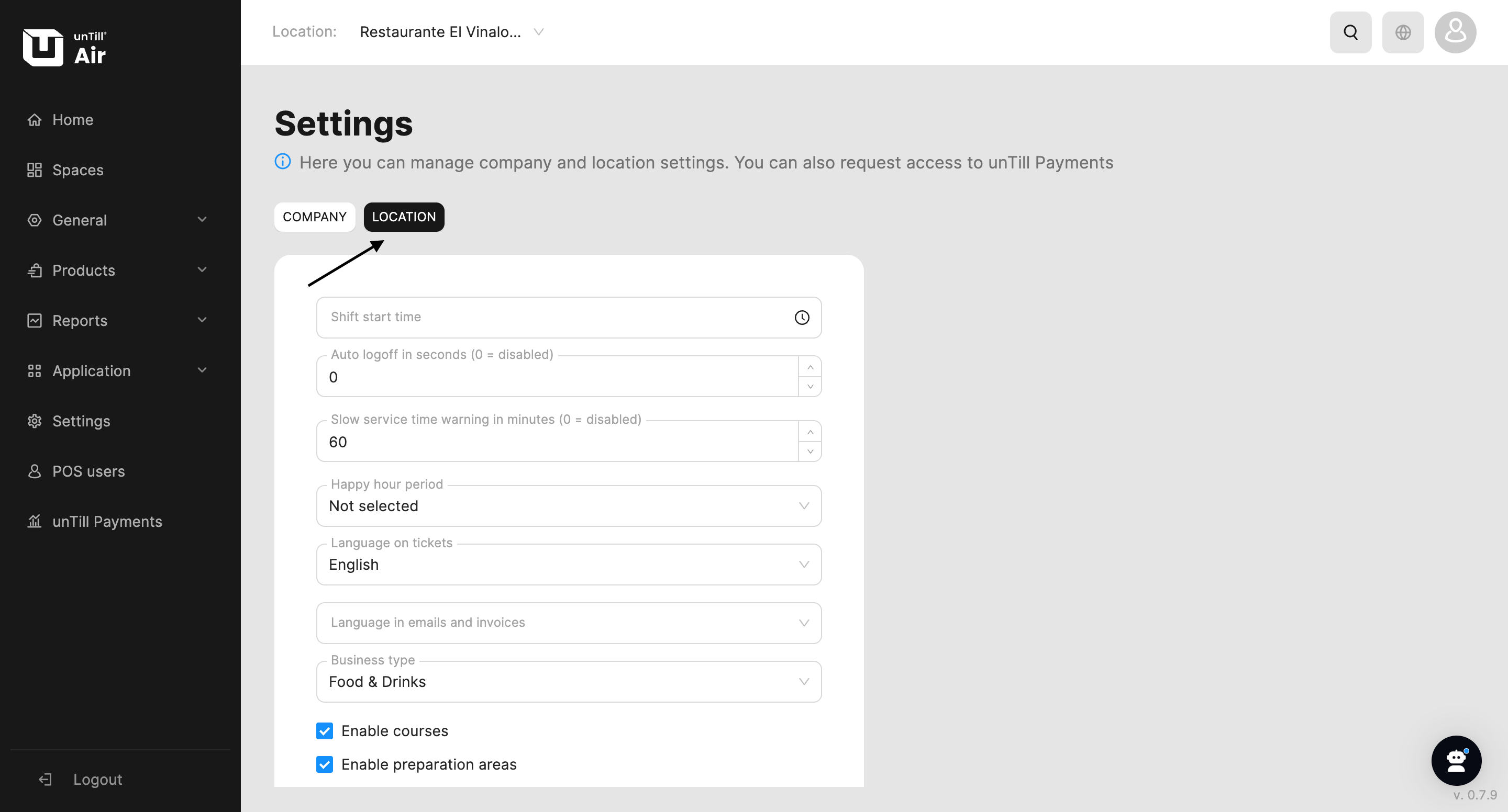 In unTill Air, you are able to manage location settings.