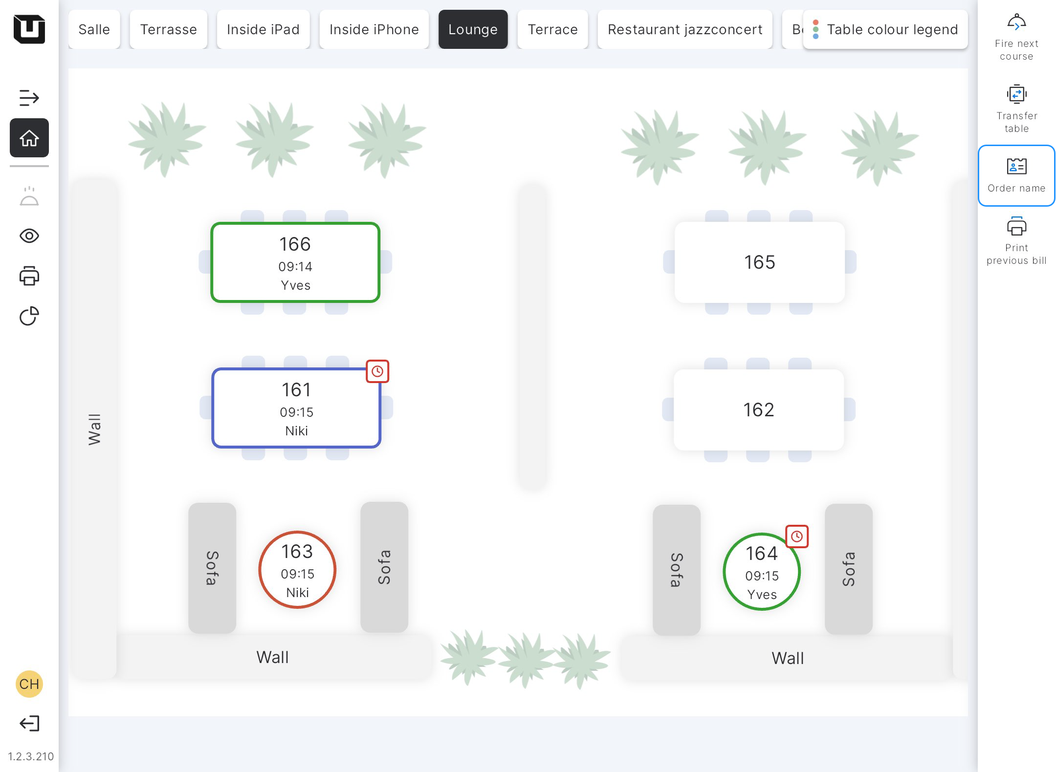 - The name will be displayed on a table insted of the table number. So, you can see the name of the client on the top, time in the middle, and the user's name at the bottom.