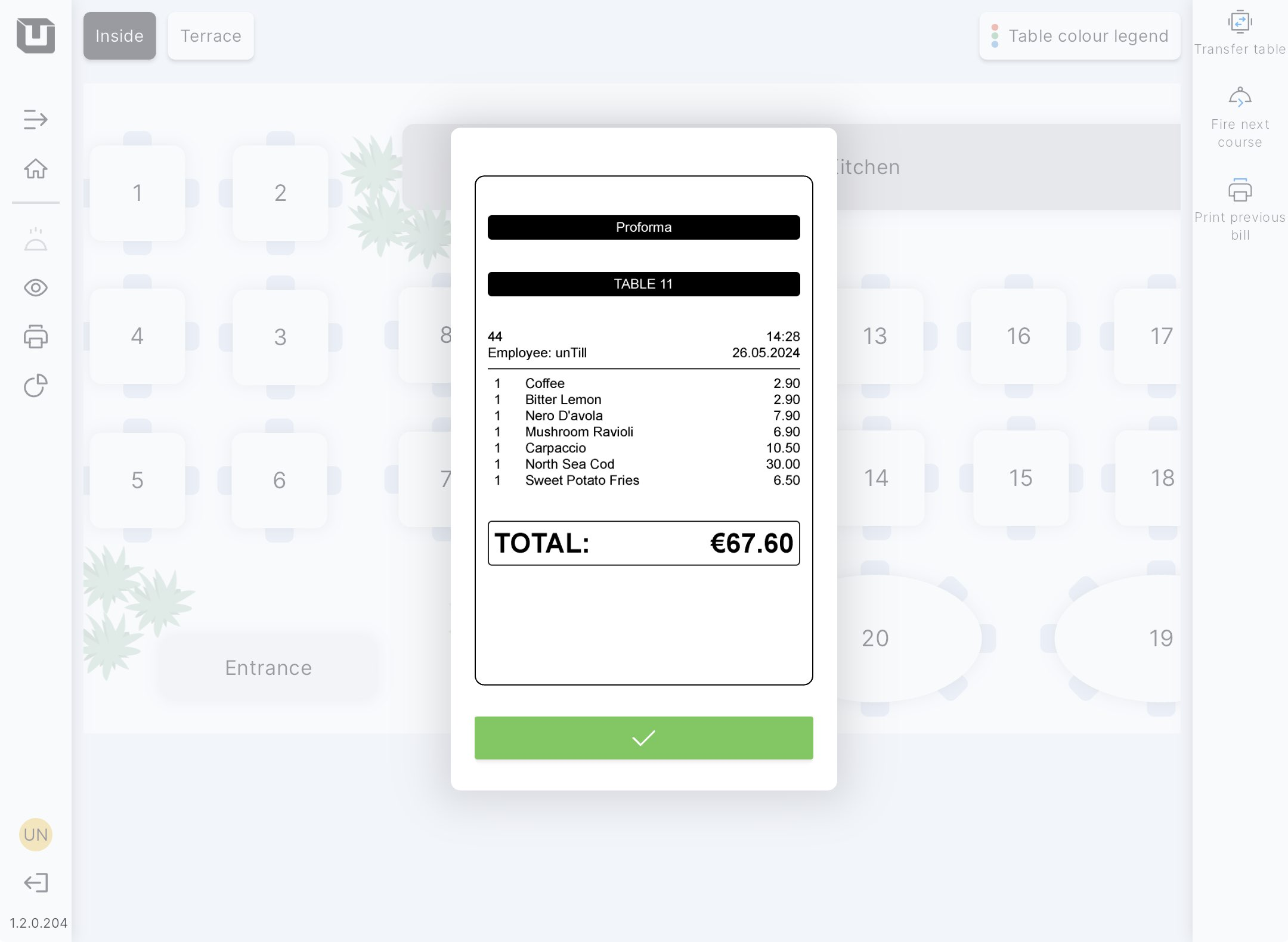 After tapping on the proforma button and issuing a ticket, you will be immediately redirected to the Table plan screen.