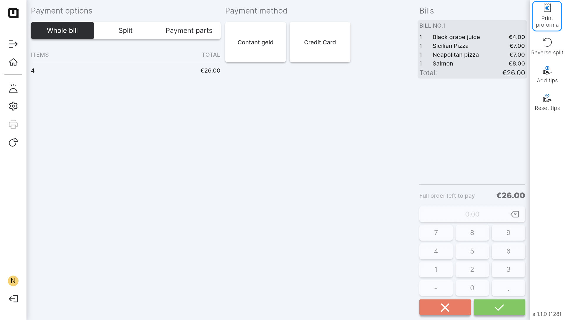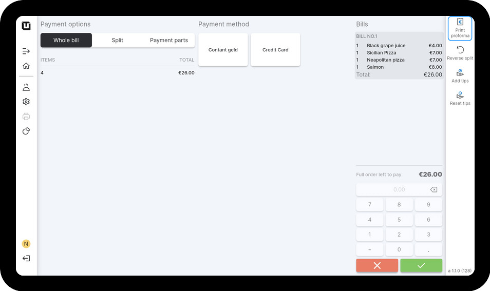 If the customer wants to receive a proforma before continuing to order or paying the bill, you can print it from the payment screen.