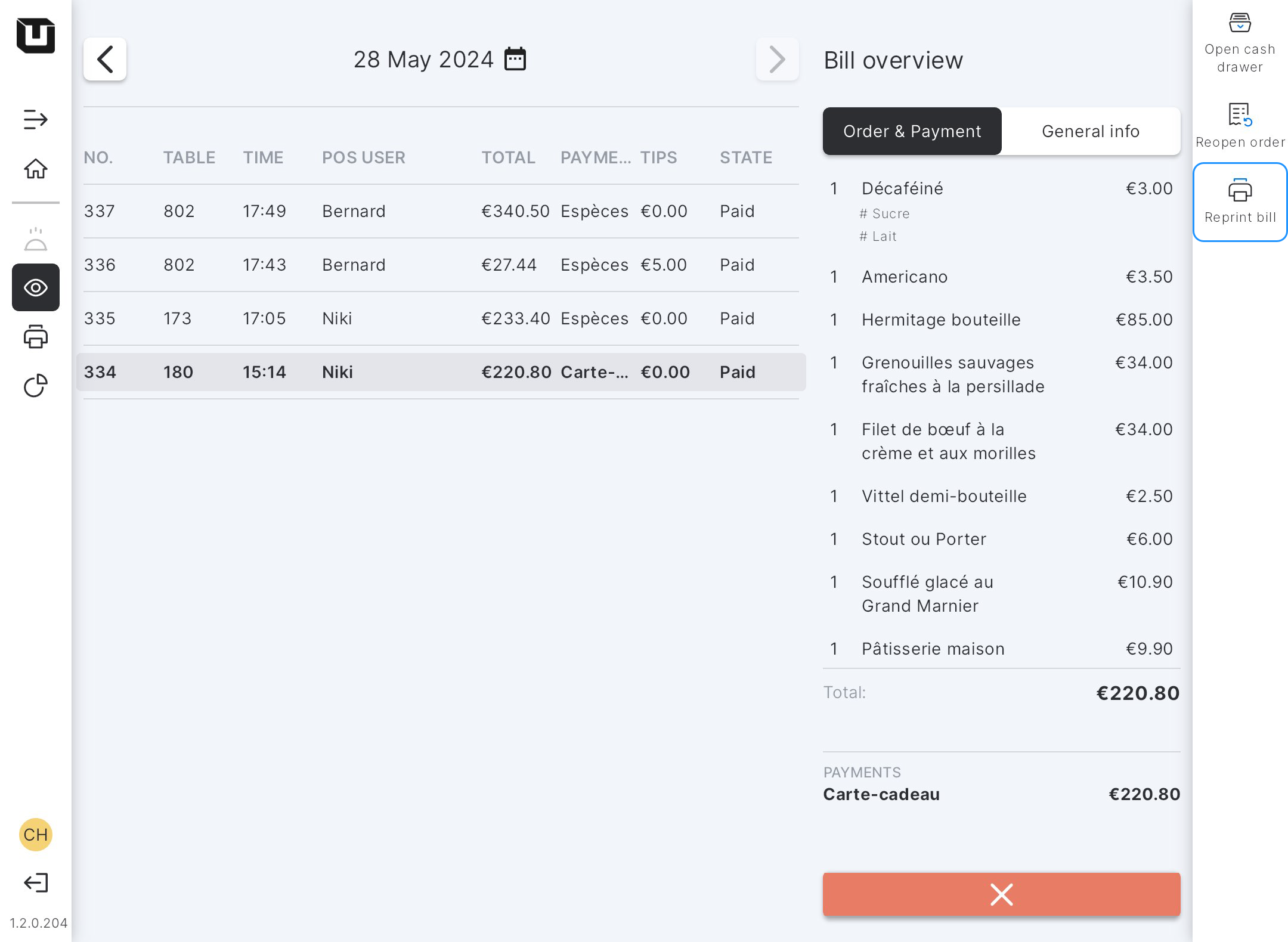 If a bill is lost or a customer wants to get it digitally once again by scanning it or emailing, you can use the 'Reprint bill' feature that allows you to reprint or reshow any bill registered in your location. Then, depending on the settings of your screen (whether your screen is set to show digital bills or to printing) you will be able to print this ticket or present a digital bill via a QR code or an email functionality.