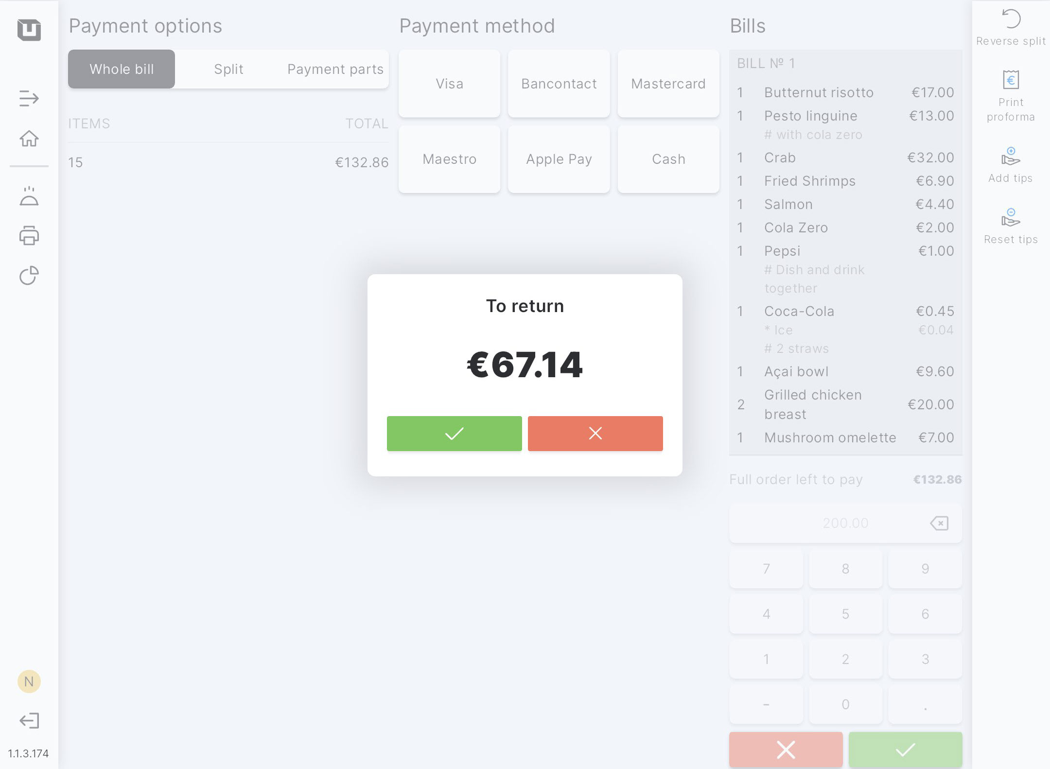 Note: After this action, you will be redirected to the table plan screen and will not be able to operate with this order anymore, as the table will be closed. If you need to remain on the payment screen after viewing the return amount, you should tap on the red button.