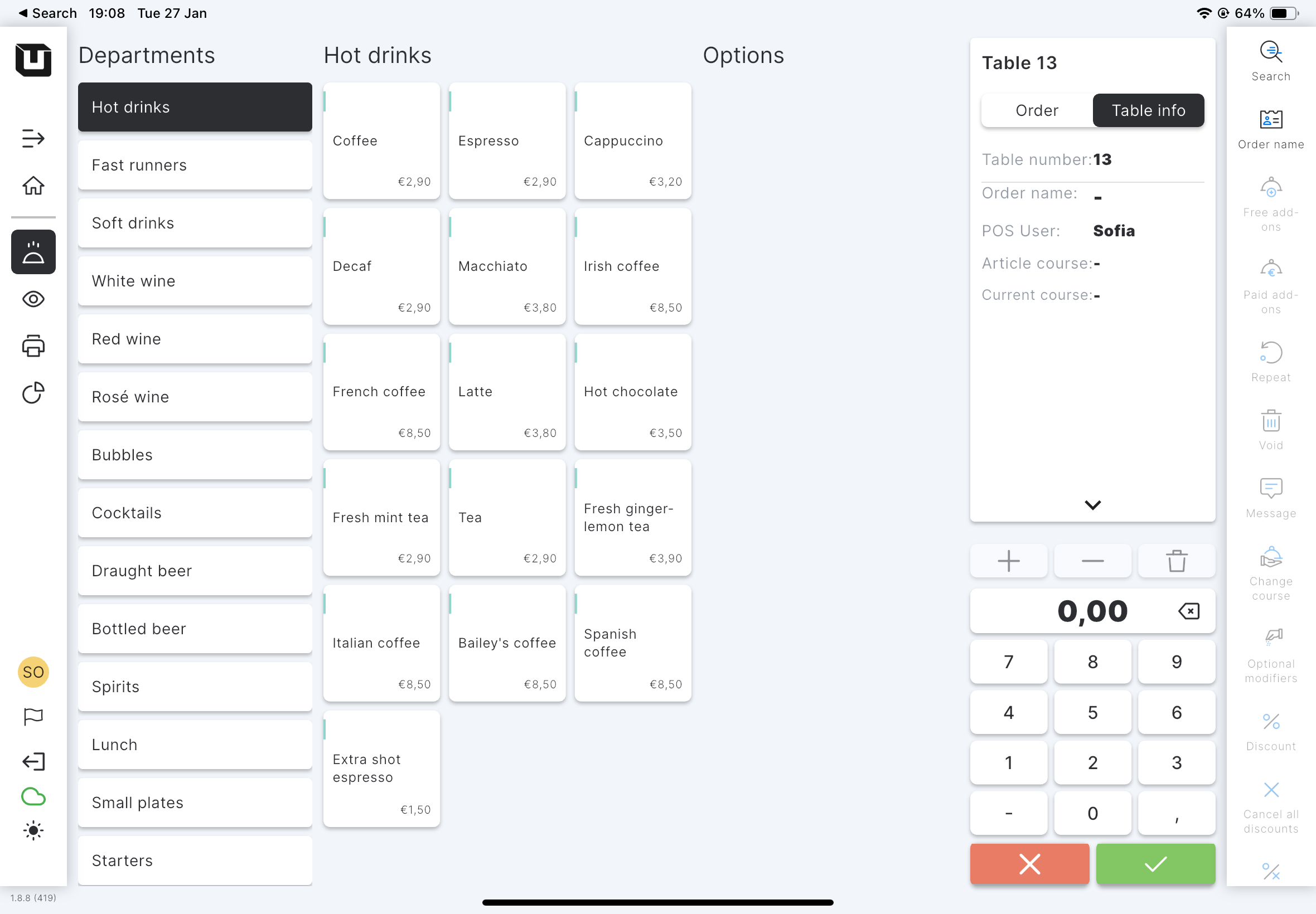 In the POS, you can track various details about the current order you are managing. This includes the current course of the overall order and the specific course for each article. Additionally, you can view the table number and the name of the current POS user who is working on this table.