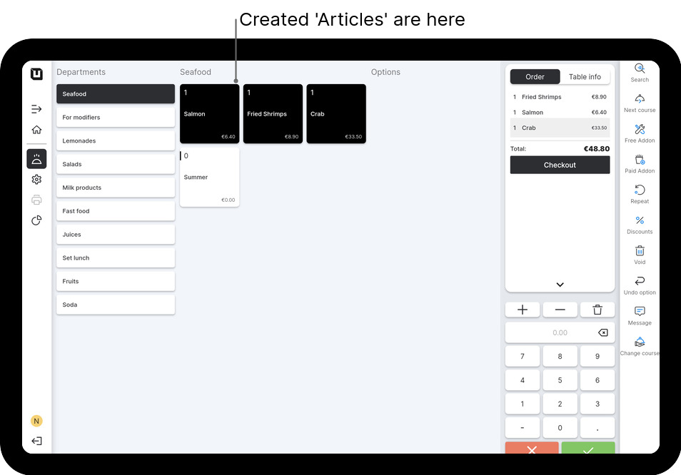 Tip: To order multiple equal Articles, you are able to do this through the functionality of the numeric keypad. First, enter the needed quantity of Articles on the numeric keypad. Secondly, tap on the desired Article.