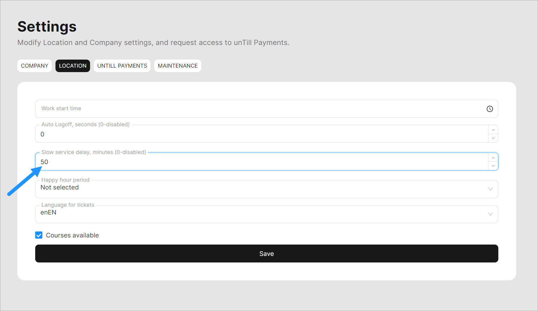 If you leave this field with the 0 value, this feature will be disabled and the POS Users within this location will not see icons indicating the slow service time.