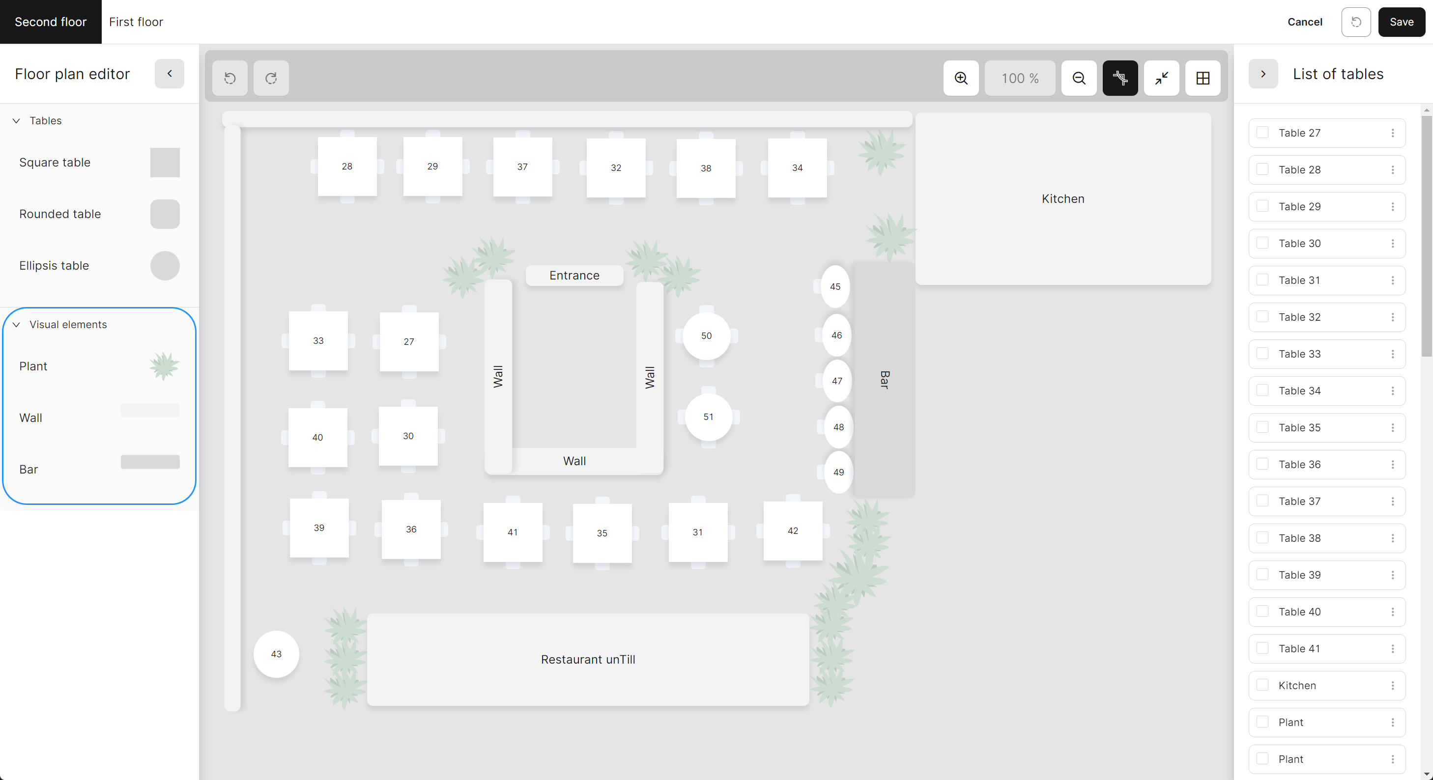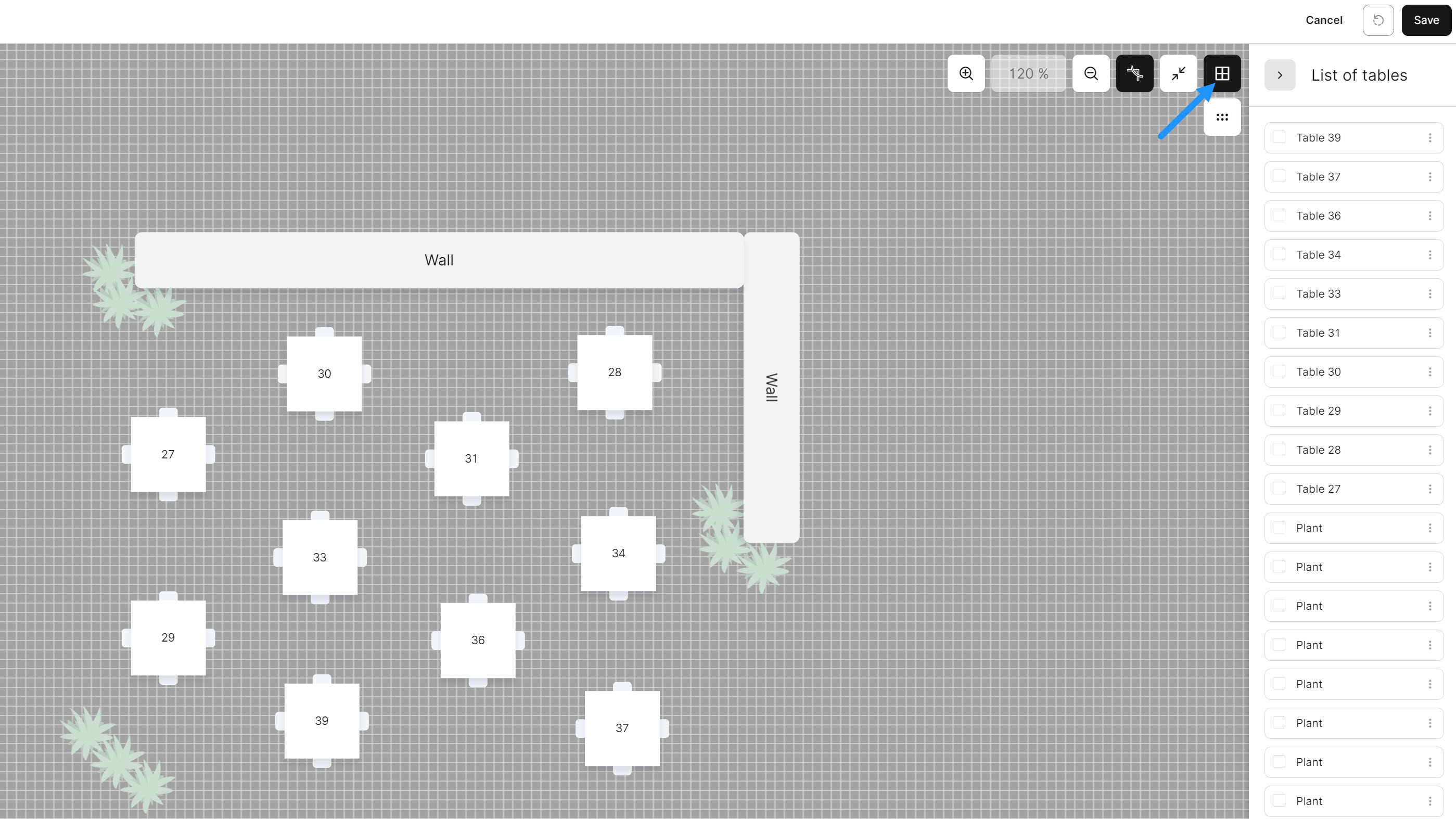 In the table editor, you can allocate directly several elements like tables, plants, and walls and move them or delete them if needed.