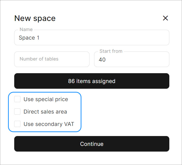 Note: If you create a space with the 'direct sales area' feature, you do not need to specify the number of tables. Upon checking the checkbox, the fields 'Number of tables' and 'Start from' will disappear.