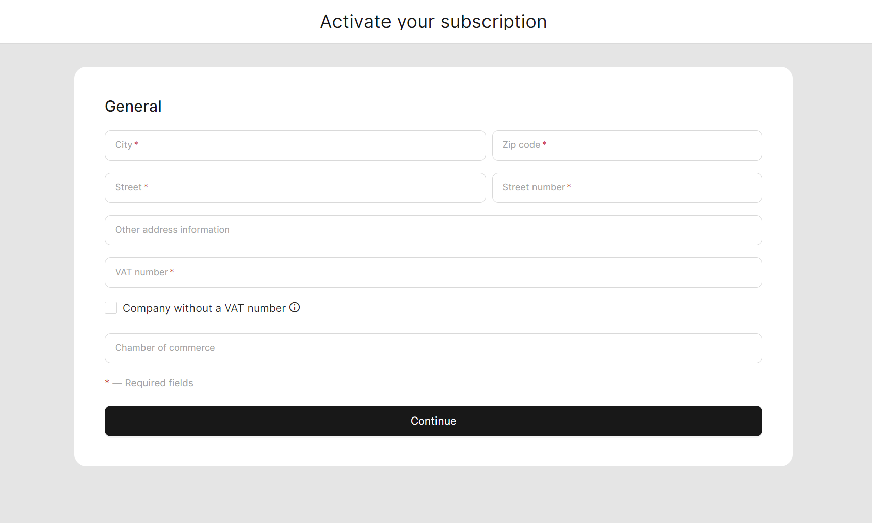 Note: If your business doesn't have a VAT number, you need to check the 'Company without a VAT number' box.