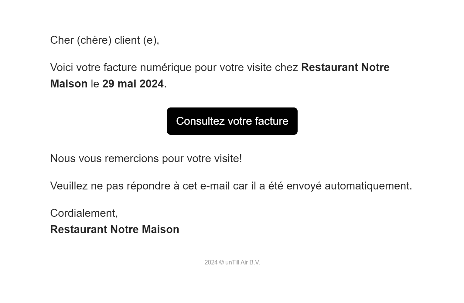 L'email reçue contenant un lien vers la page du navigateur de factures où le client peut consulter la facture est envoyé à l'adresse électronique spécifiée. Cet e-mail indique l'établissement où la facture a été payée et la date de facturation. Vous voyez ici un exemple de l'e-mail que vos clients reçoivent après l'envoi de la facture par e-mail :