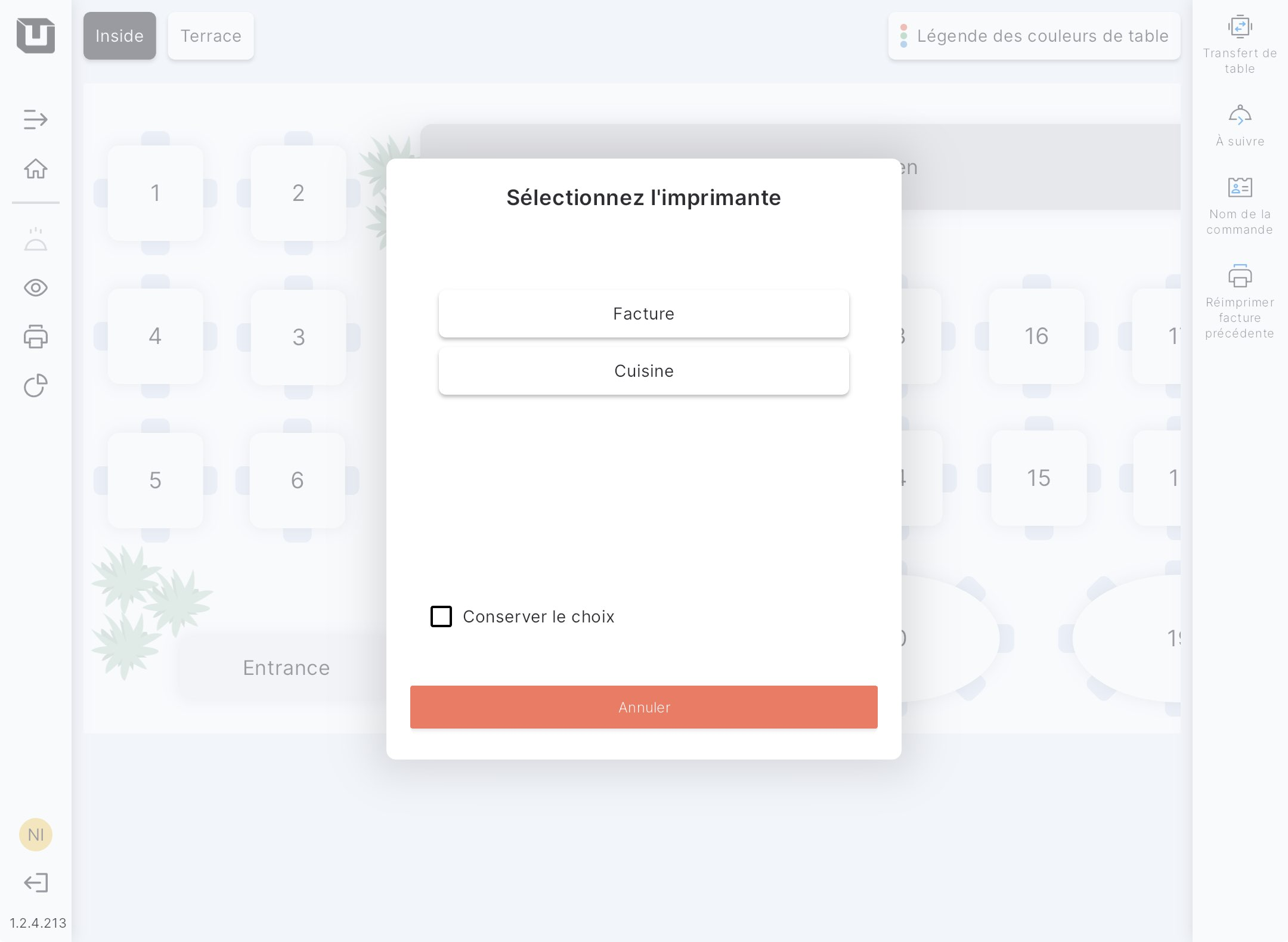 Si vous n'avez ajouté qu'une seule imprimante de factures, les tickets seront émis sur cette imprimante, mais si vous avez plusieurs imprimantes de factures dans le Back Office, il vous sera demandé de sélectionner l'imprimante sur laquelle vous souhaitez que la facture soit imprimée.