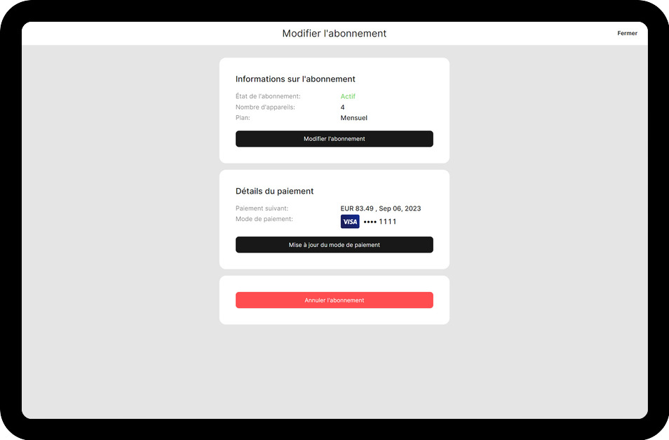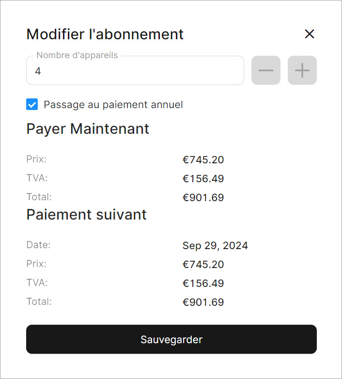 Remarque : Lorsque vous augmentez le nombre d'Écrans, le coût de l'abonnement sera recalculé en conséquence.
