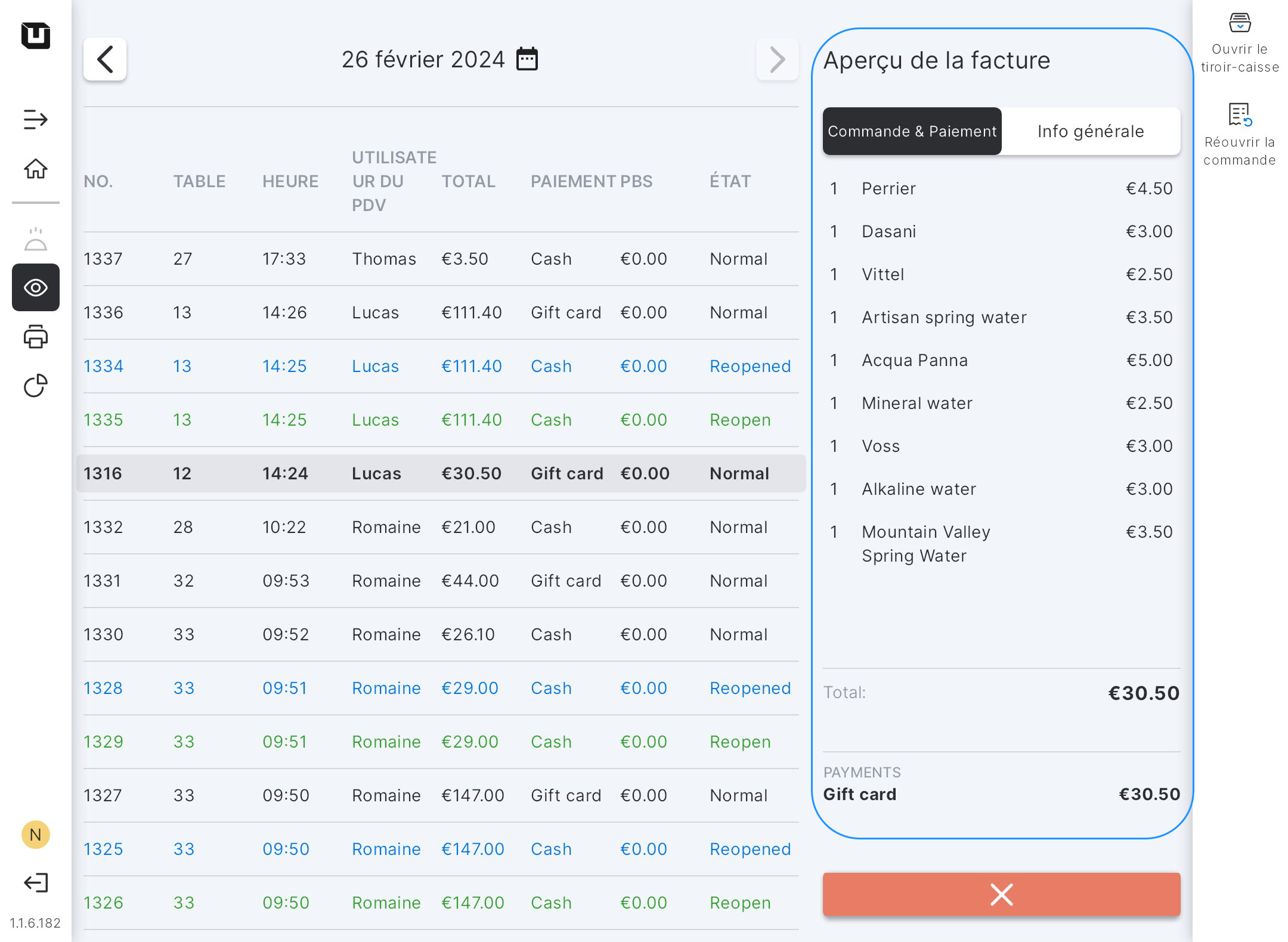Cet écran vous permet de consulter les détails de chaque transaction effectuée au cours de la journée. Vous pouvez passer au jour ouvrable précédent et obtenir des informations sur les montants totaux de ces factures, les utilisateurs du point de vente qui ont accepté ce paiement, la liste des articles commandés, la méthode de paiement utilisée, etc.