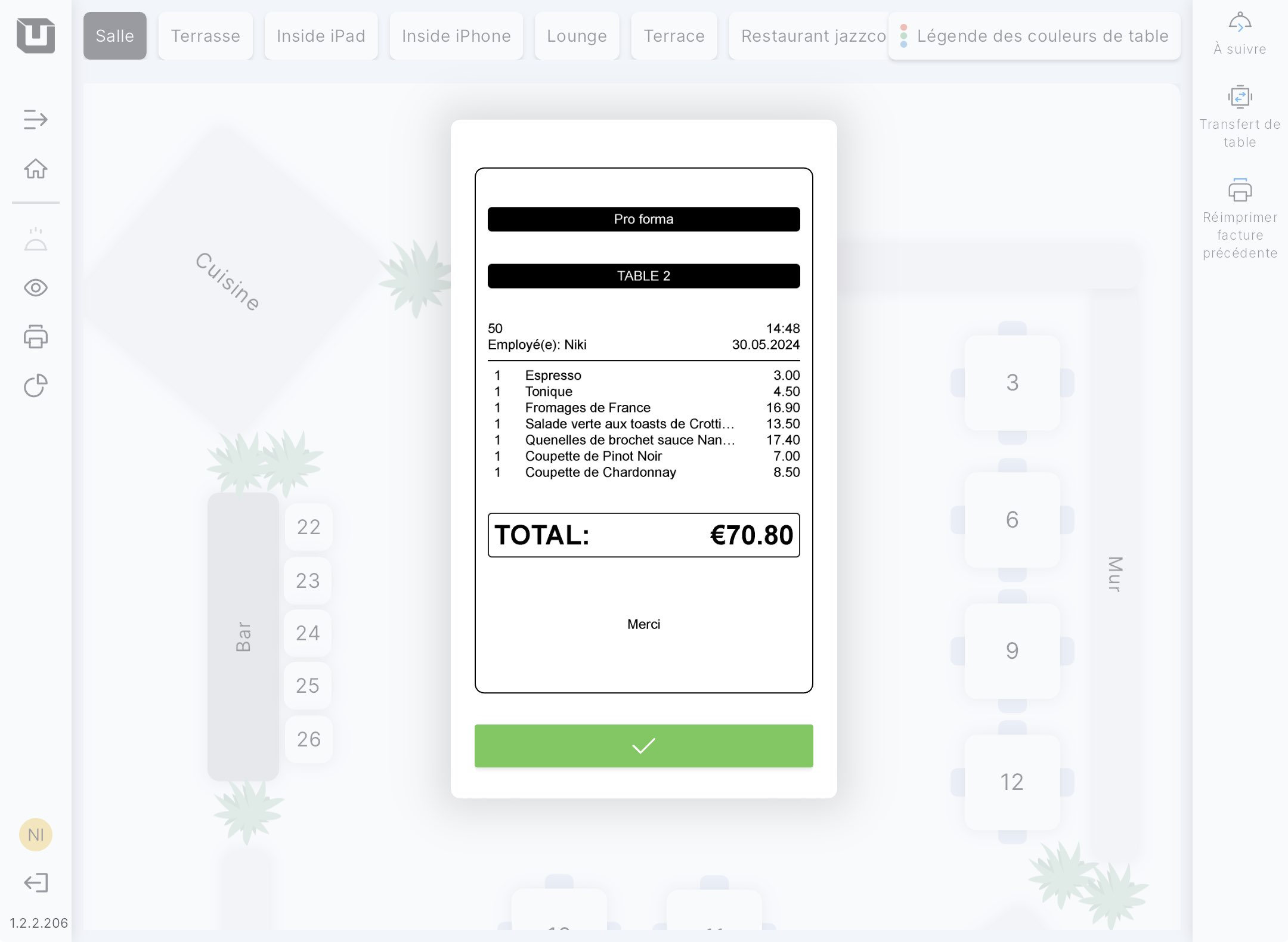 Après avoir cliqué sur le bouton pro forma et émis un billet, vous serez immédiatement redirigé vers l'écran du plan de salle.