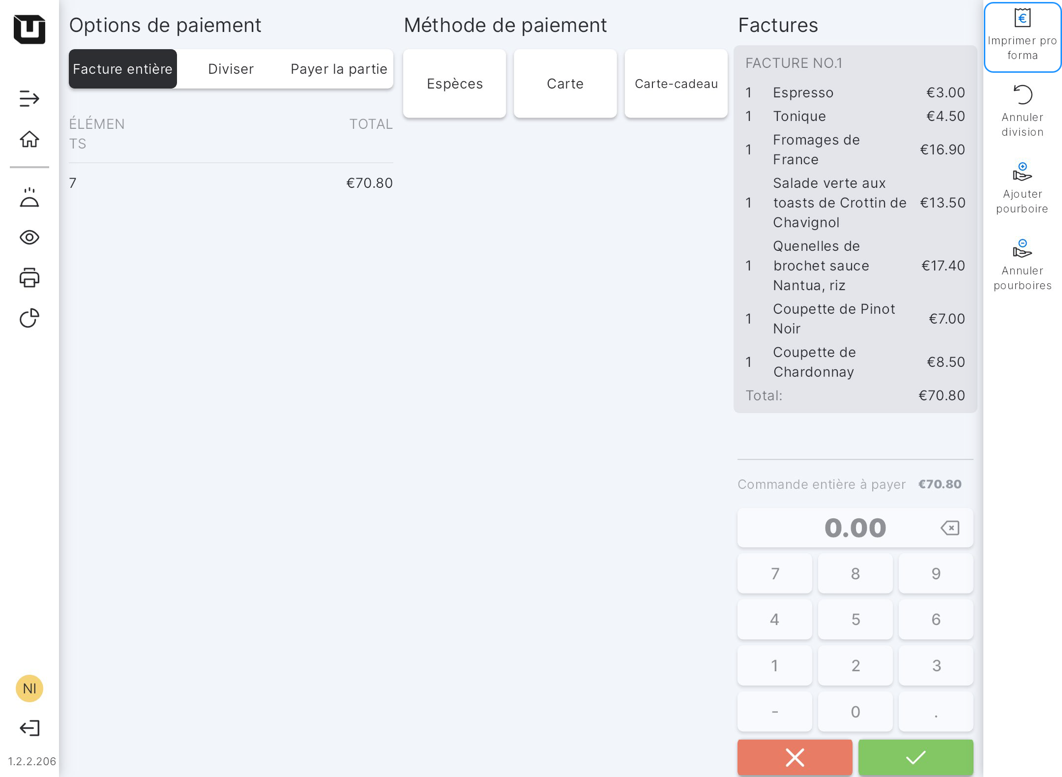 La proforma a été émise, mais elle n'entraîne aucune restriction. Vous pouvez toujours transférer la table, commander d'autres articles et diviser la facture.
