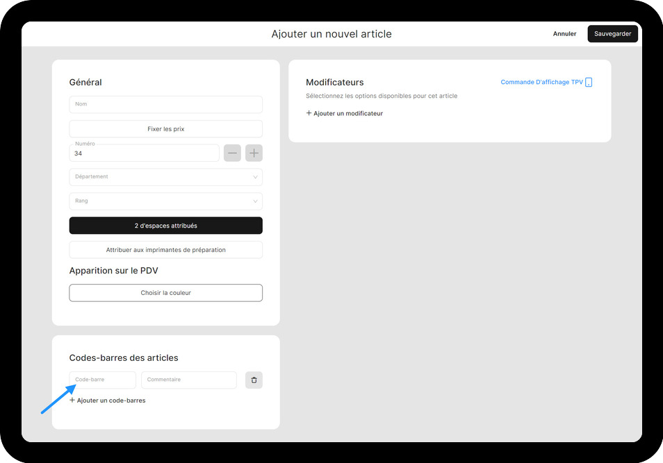 - Vous pouvez ajouter un Modificateur à votre nouvel Article. Pour des instructions sur la création de Modificateurs, consultez cette page.