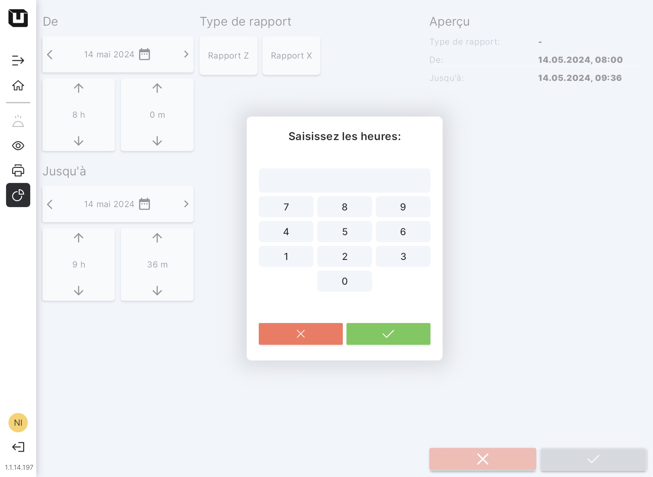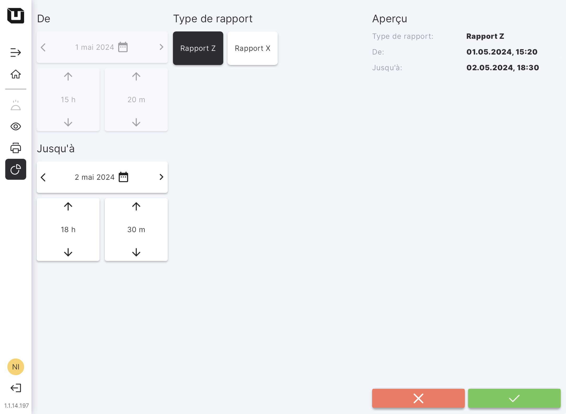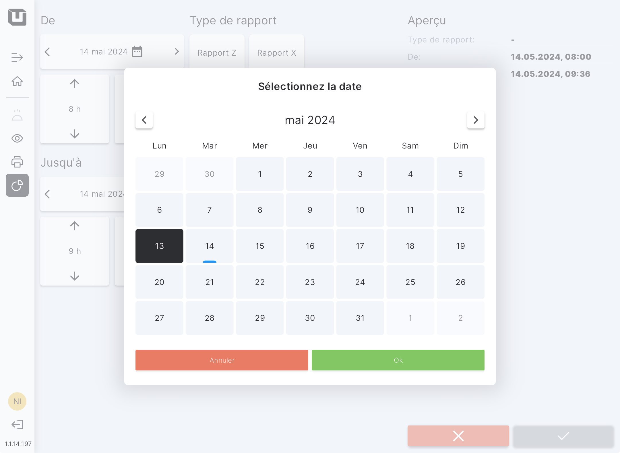 - Après avoir sélectionné la date et l'heure du rapport, appuyez sur le bouton vert 'confirmer' :white_check_mark: situé dans le coin inférieur droit.