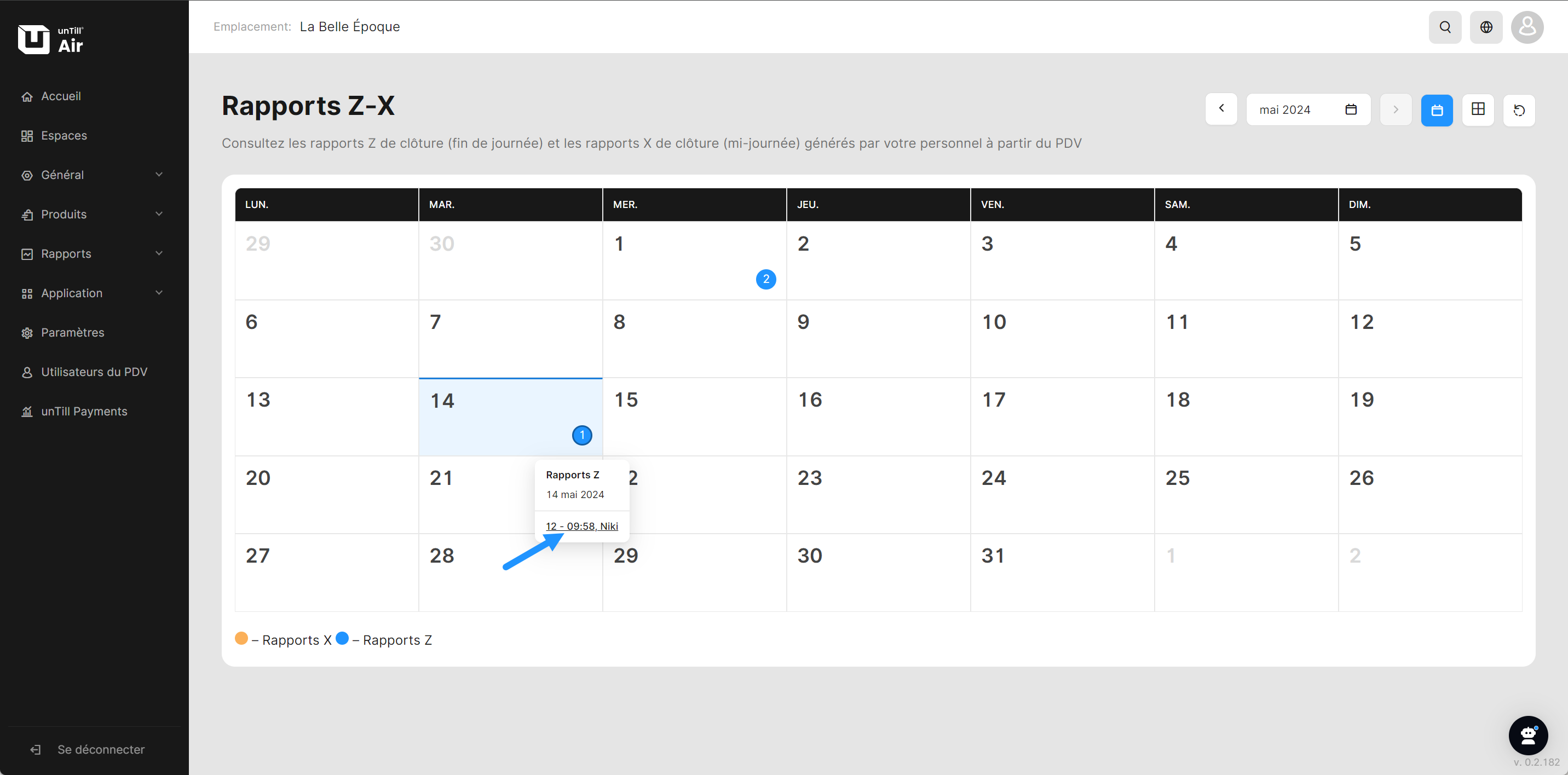 Dans le calendrier, les rapports Z et X sont affichés sous forme de cercles. Les cercles sont de couleurs différents, le bleu signifie que le rapport Z a été imprimé, l'orange signifie que le rapport X a été imprimé.