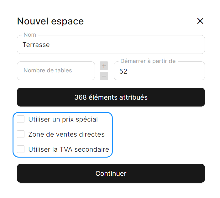 Remarque : Si vous configurez un Espace avec la fonctionnalité 'Zone de ventes directs', vous n'avez pas besoin de spécifier le nombre de tables. Lorsque la case à cocher est activée, les champs 'Nombre de tables' et 'Démarrer à partit de' vont disparaître.