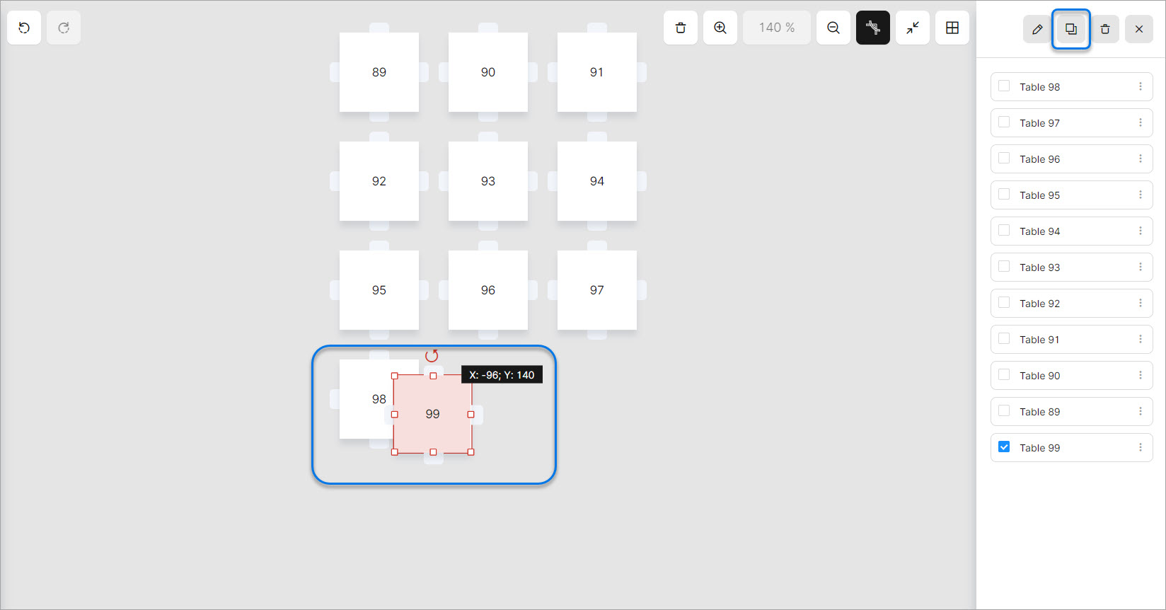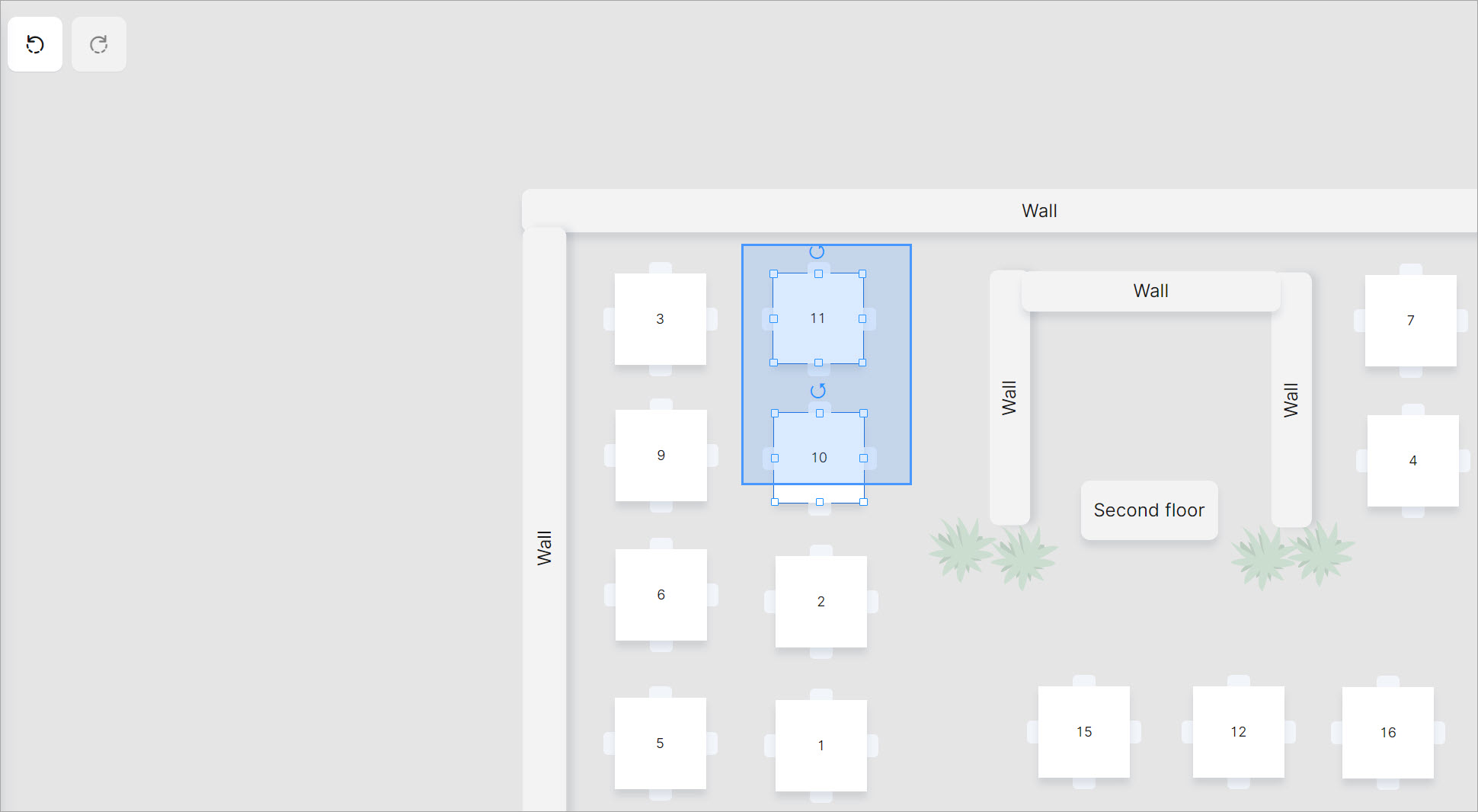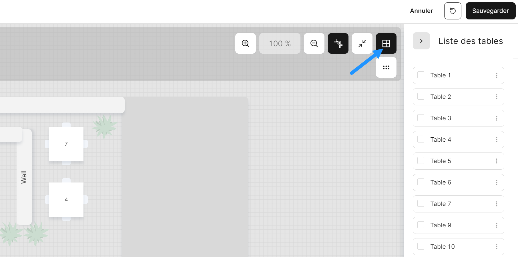 Dans l'éditeur de tables, vous pouvez attribuer directement plusieurs éléments tels que des tables, des plantes et des murs et les déplacer ou les supprimer si nécessaire.